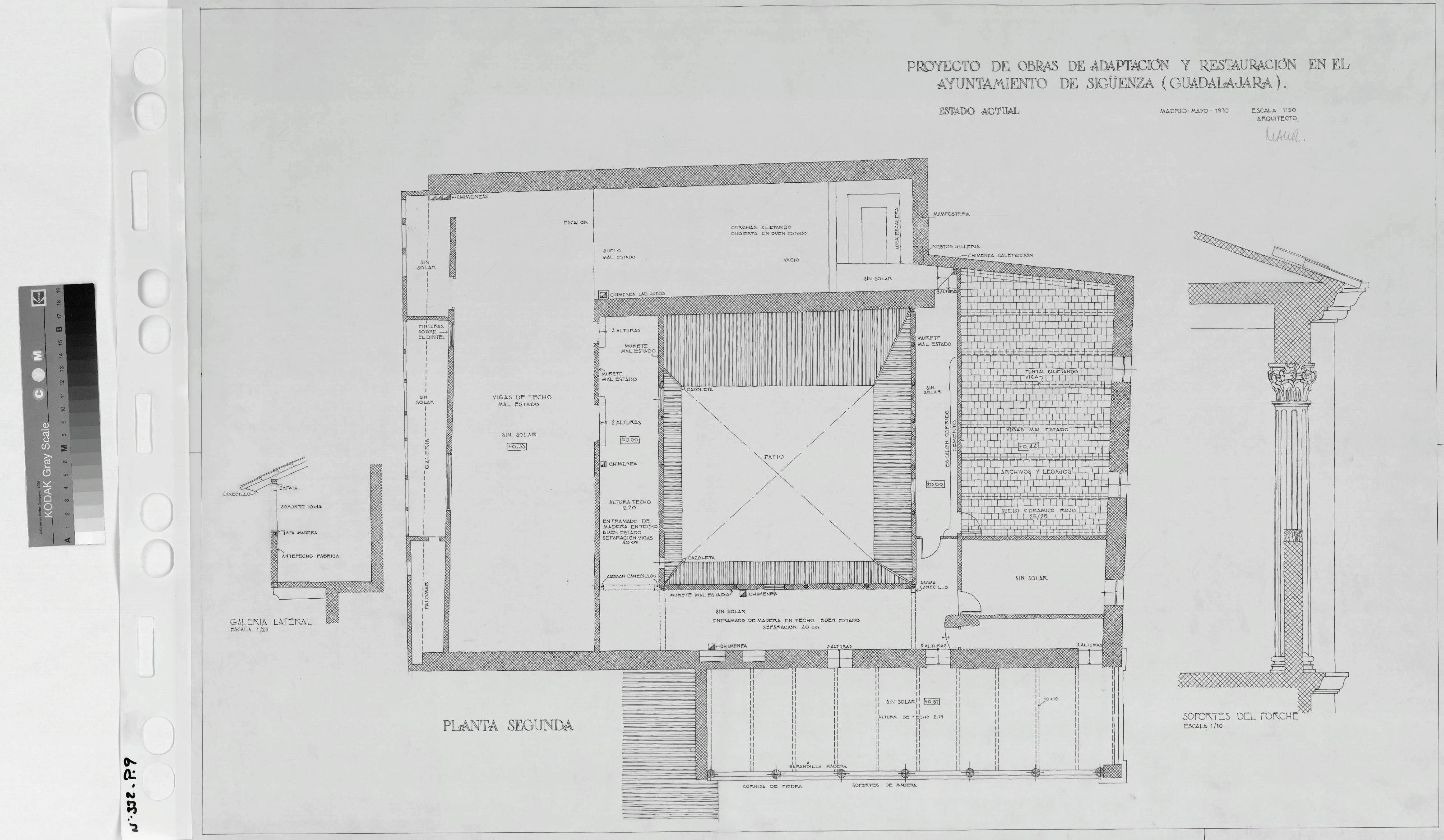 AYUNTAMIENTO DE SIGÜENZA - GUADALAJARA-: PLANTA SEGUNDA , PROYECTO DE ADAPTACION Y RESTAURACION, Planta segunda, estado actual, plano con descripcion de pavimentos, soportes de madera, vigas, entarimados, y con alguna cota en altura, detalle de galeria lateral y soportes de porche, plano sin cotas.
