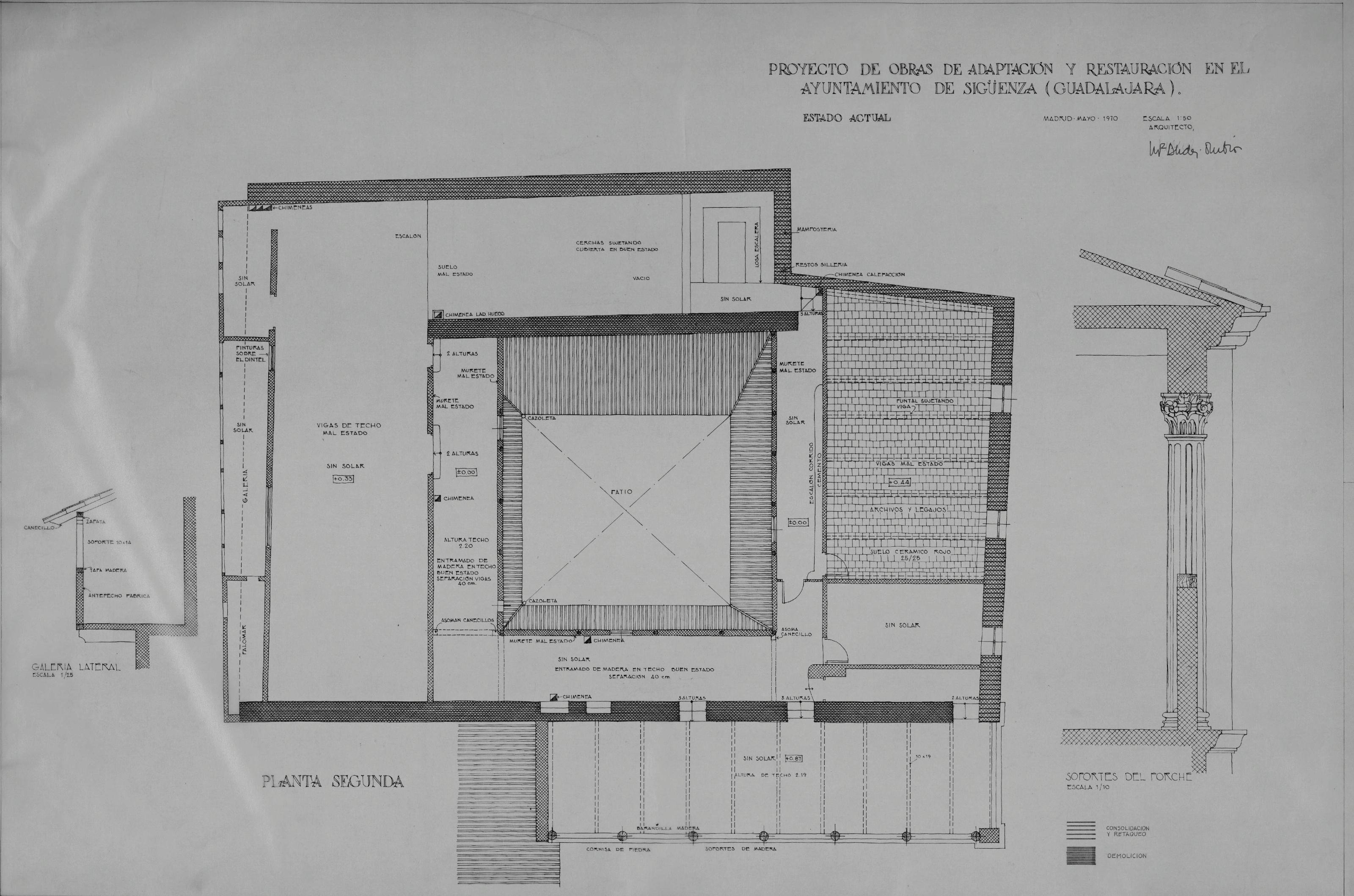 AYUNTAMIENTO DE SIGÜENZA - GUADALAJARA-: PLANTA SEGUNDA , PROYECTO DE ADAPTACION Y RESTAURACION, Planta segunda, en este plano nos marca dos zonas a tratar una es consolidacion y retaqueo y otra demolicion, plano sin cotas.