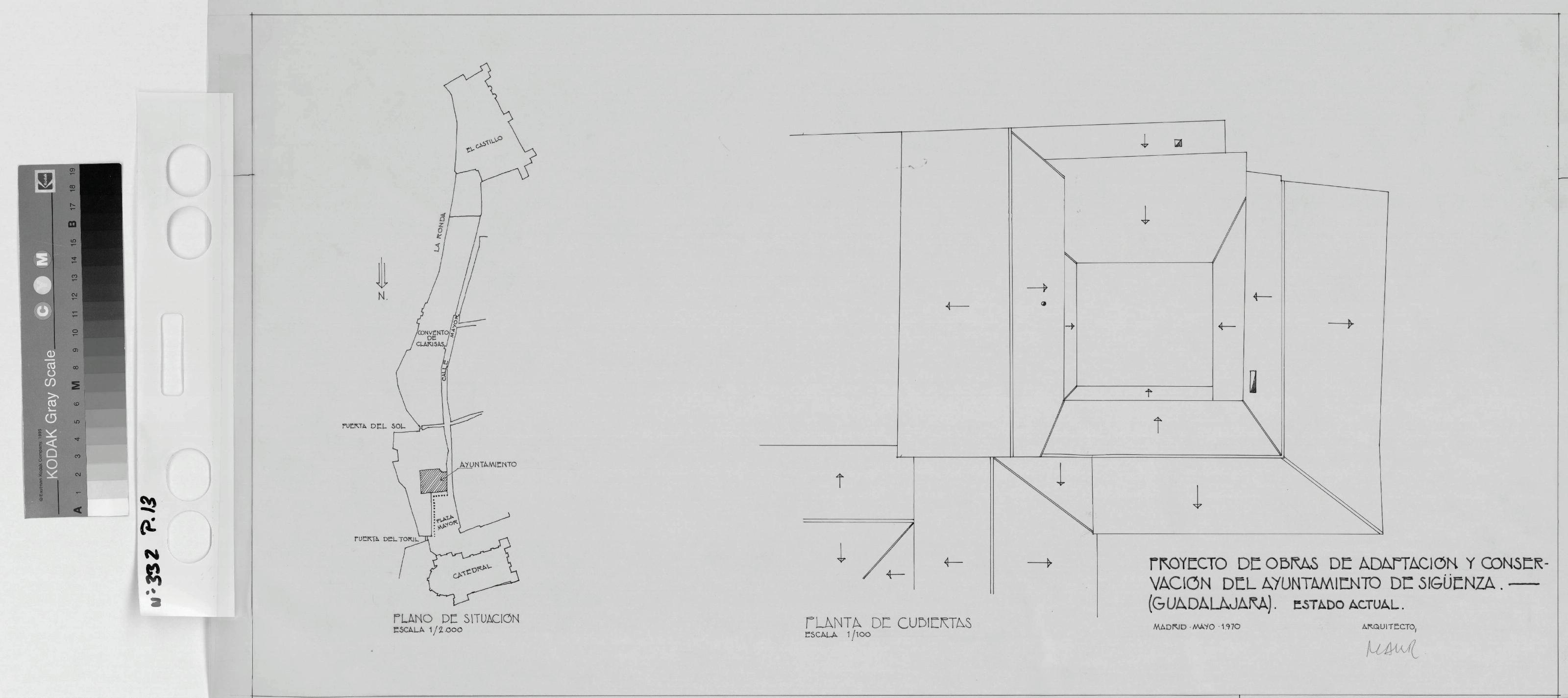 AYUNTAMIENTO DE SIGÜENZA - GUADALAJARA-: PLANTA CUBIERTAS , PROYECTO DE ADAPTACION Y RESTAURACION, Planta de cubiertas, estado actual, y plano de situacion esc. 1/2000. plano sin cotas.