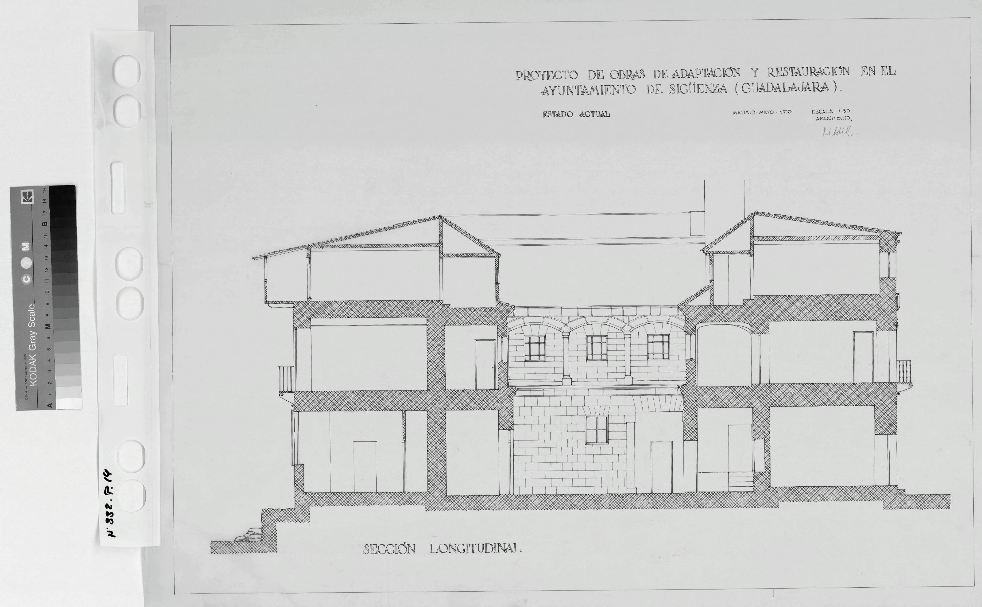 AYUNTAMIENTO DE SIGÜENZA - GUADALAJARA-: SECCION LONGITUDINAL , PROYECTO DE ADAPTACION Y RESTAURACION, Seccion longitudinal, estado actual, muros seccionado y regruesados, plano sin cotas.
