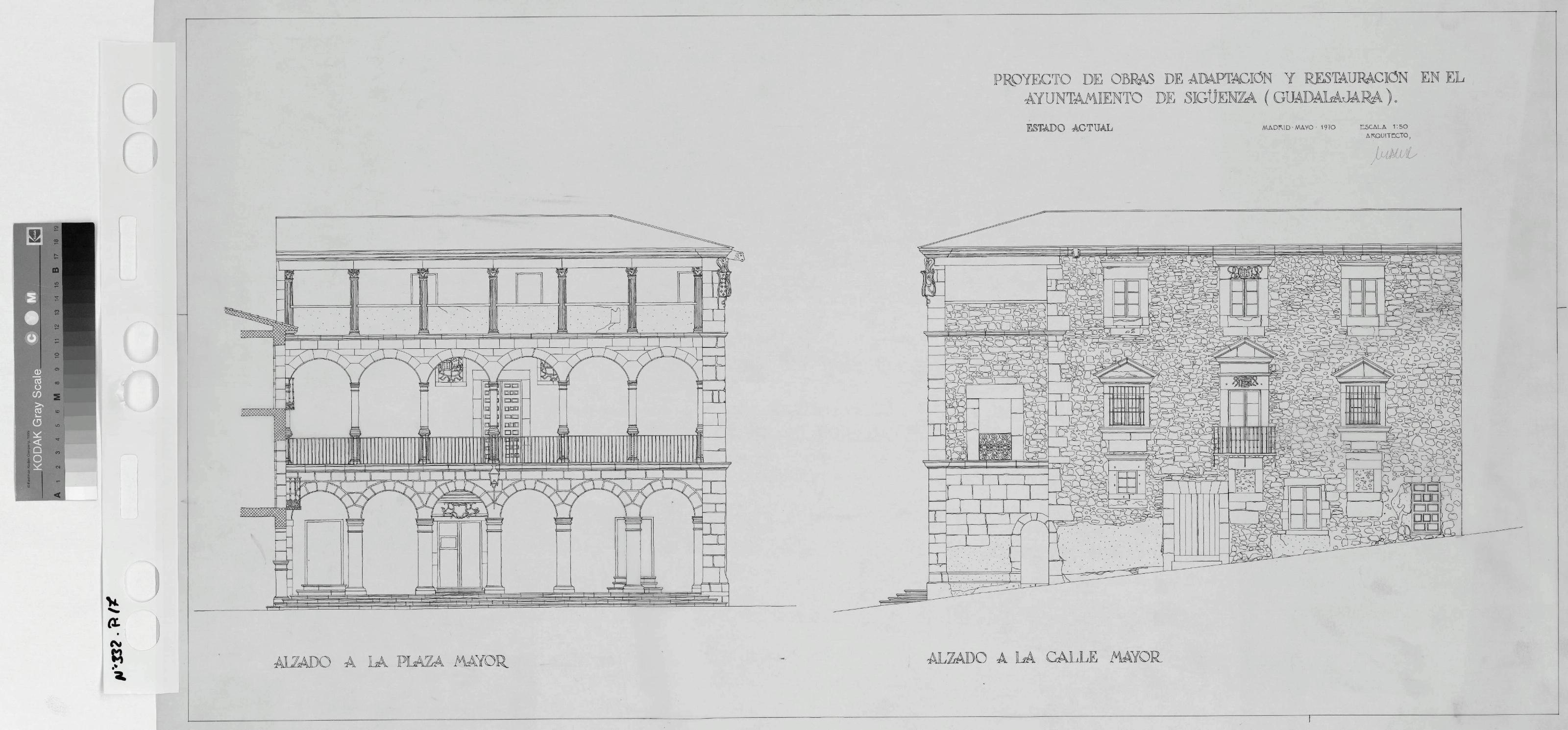 AYUNTAMIENTO DE SIGÜENZA - GUADALAJARA-: ALZADO A PLAZA MAYOR, Y ALZADO A CALLE MAYOR , PROYECTO DE ADAPTACION Y RESTAURACION, Alzados , estado actual, dibujado con detalle. plano sin cotas.