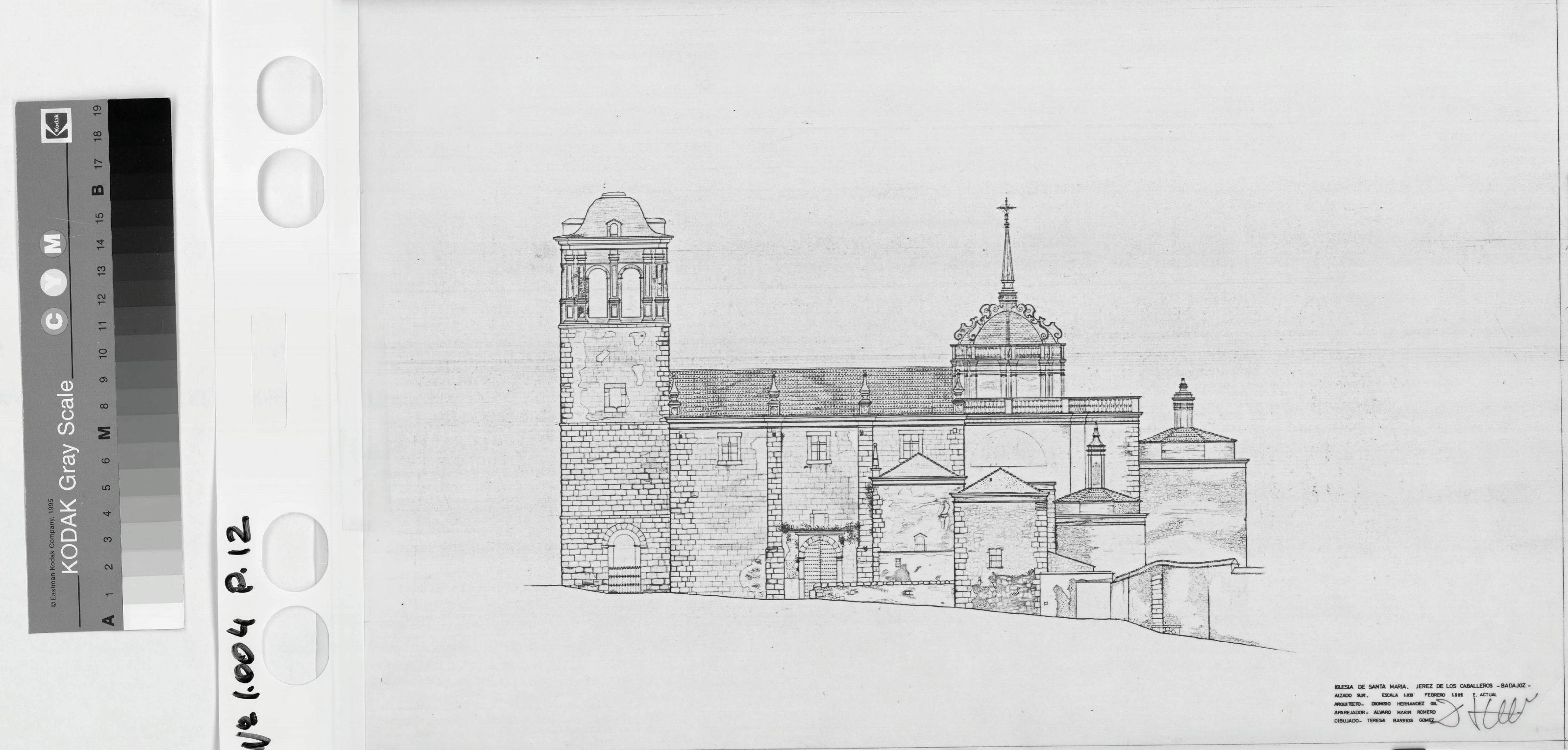 IGLESIA DE SANTA MARIA JEREZ DE LOS CABALLEROS (Badajoz): ALZADO SUR - E. ACTUAL Con tratamiento a lápiz de desperfectos y despieces. Firmado