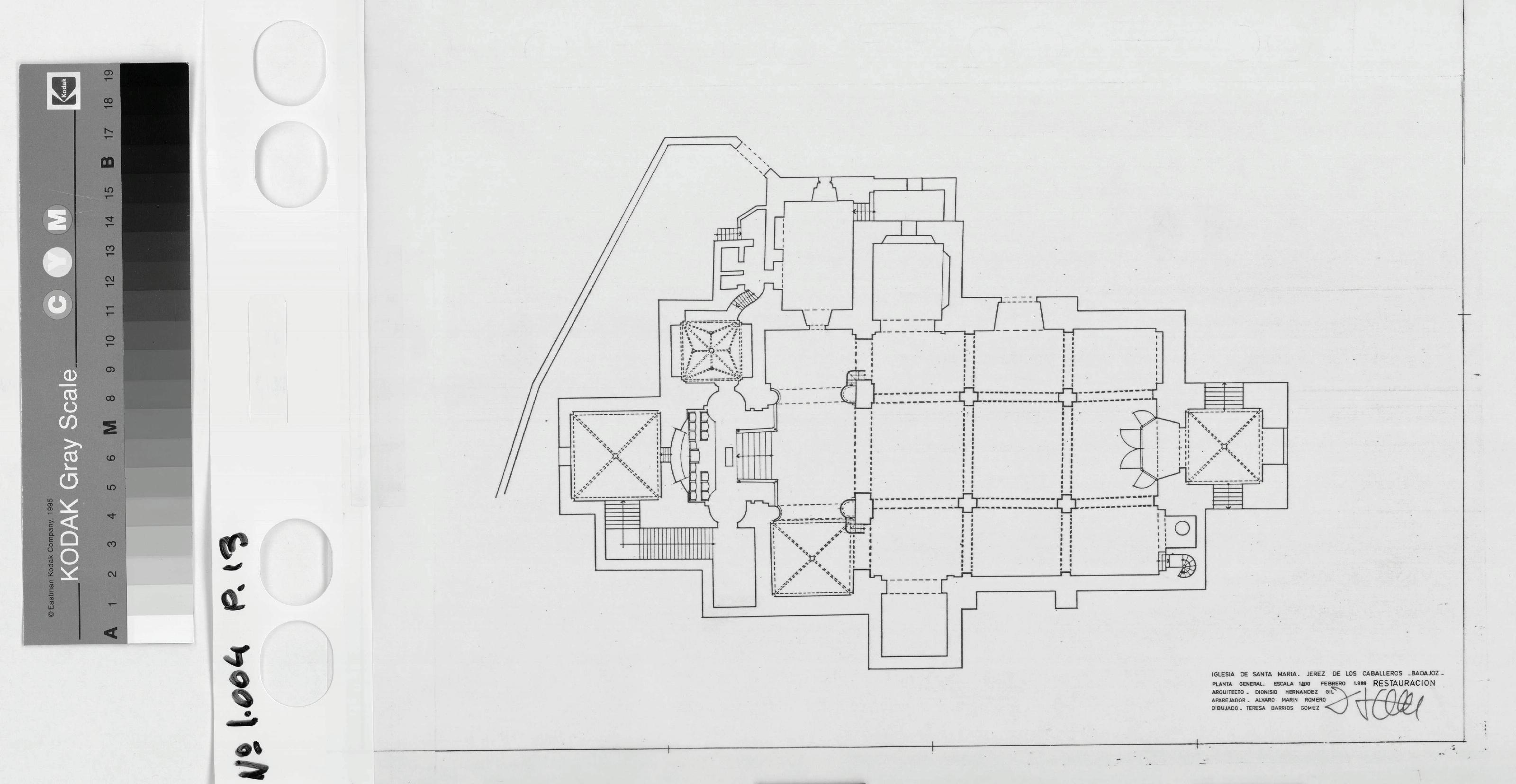 IGLESIA DE SANTA MARIA JEREZ DE LOS CABALLEROS (Badajoz): PLANTA GENERAL - RESTAURACIÓN Con proyección de bóvedas. Firmado