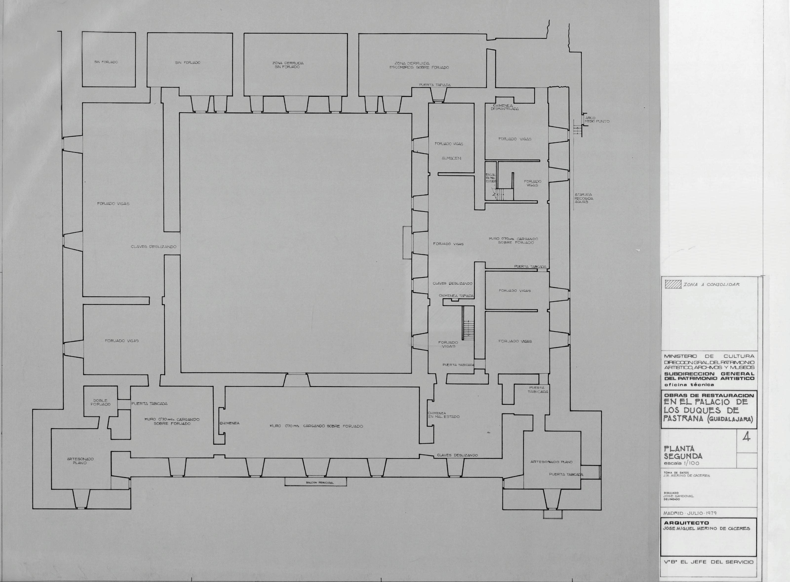 PALACIO DE LOS DUQUES DE PASTRANA - GUADALAJARA-: PLANTA SEGUNDA, Plano con descripcion de elementos y zonas a reparar, sin acotar.