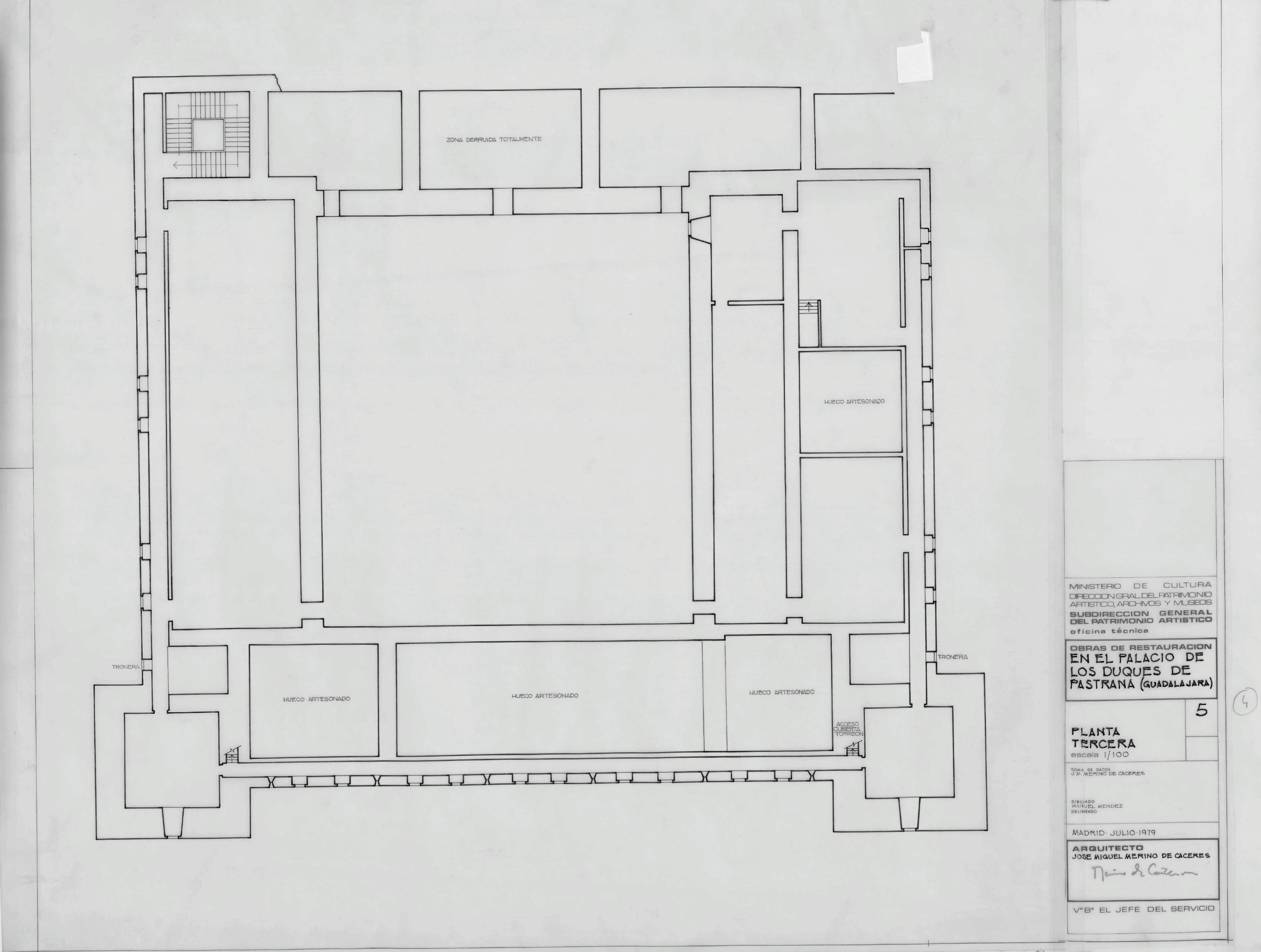 PALACIO DE LOS DUQUES DE PASTRANA - GUADALAJARA-: PLANTA TERCERA, plano de distribucion , marca las zonas donde van los huecos del artesonado, plano sin cotas,