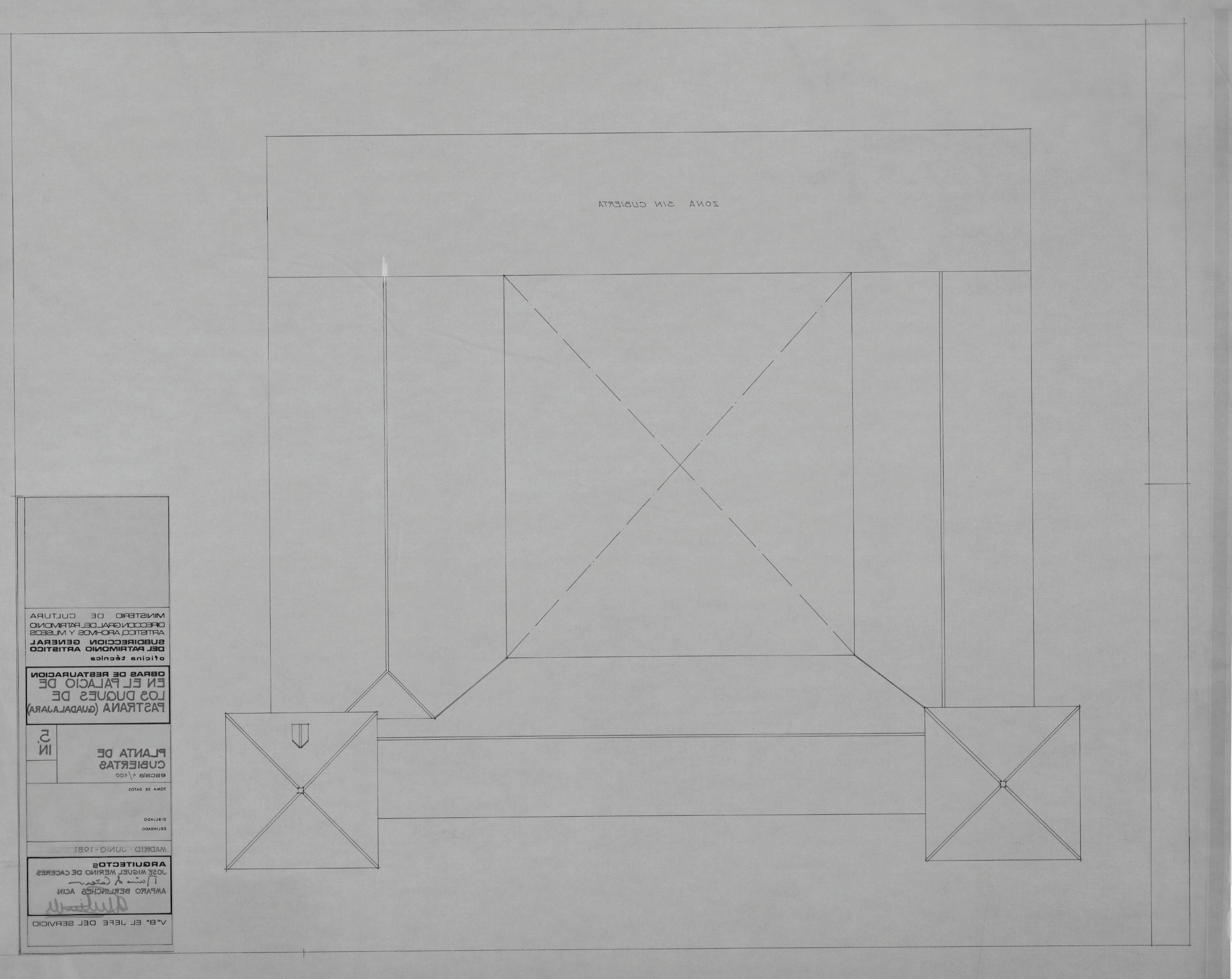 PALACIO DE LOS DUQUES DE PASTRANA - GUADALAJARA-: PLANTA DE CUBIERTAS, plano de cubiertas, marca una zona donde aparece una zona sin cubiertas, plano sin cotas,