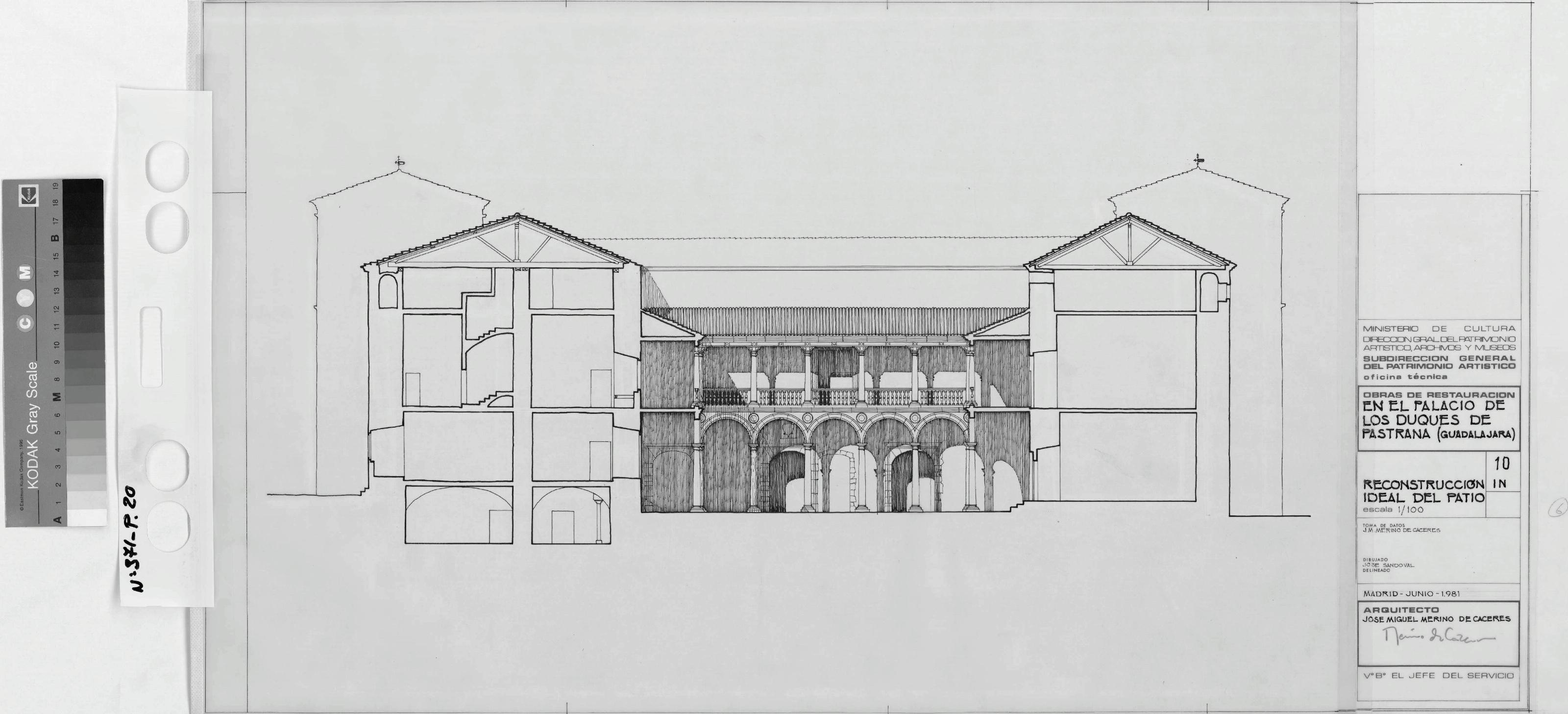 PALACIO DE LOS DUQUES DE PASTRANA - GUADALAJARA-: RECONSTRUCCION IDEAL DEL PATIO. Plano de seccion y alzado al patio, dibujado con detalle, plano sin cotas .
