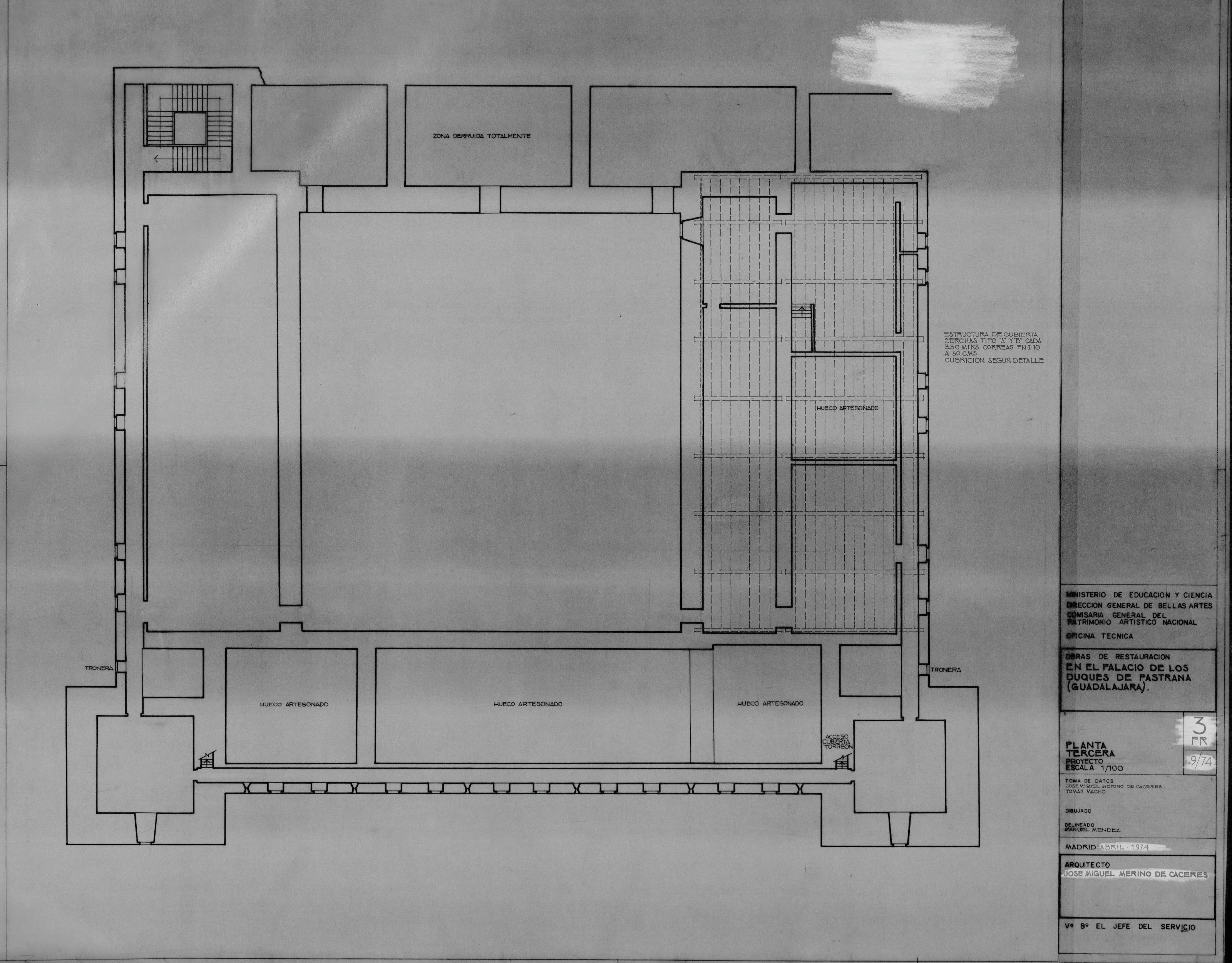 PALACIO DE LOS DUQUES DE PASTRANA - GUADALAJARA-: PLANTA TERCERA PROYECTO. Planta , señala una zona de estructura de cubierta, y marca los huecos de artesonado, plano sin cotas.