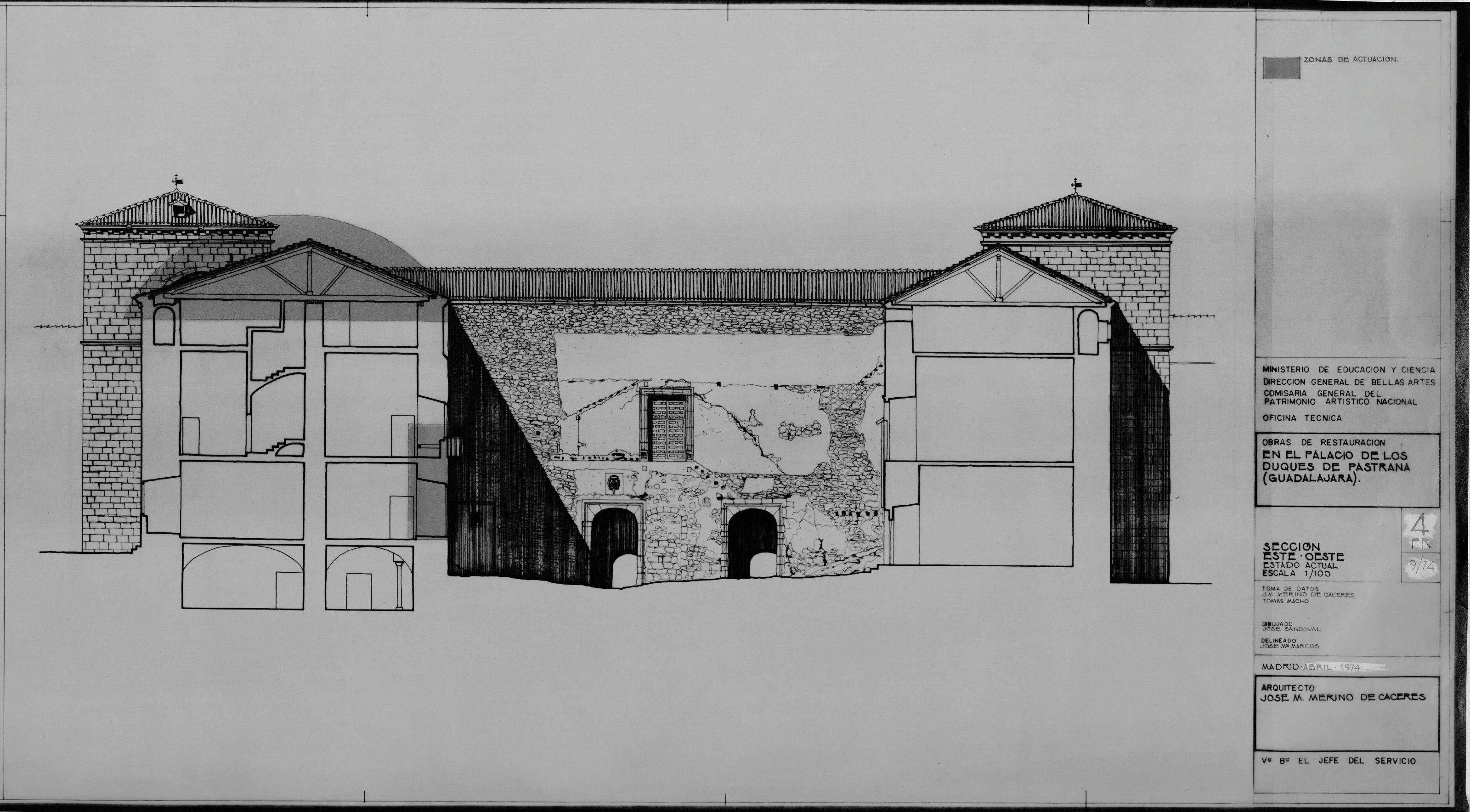 PALACIO DE LOS DUQUES DE PASTRANA - GUADALAJARA-: SECCION ESTE-OESTE. Estado actual, plano donde aparece una zona de actuacion marcada, plano sin cotas.