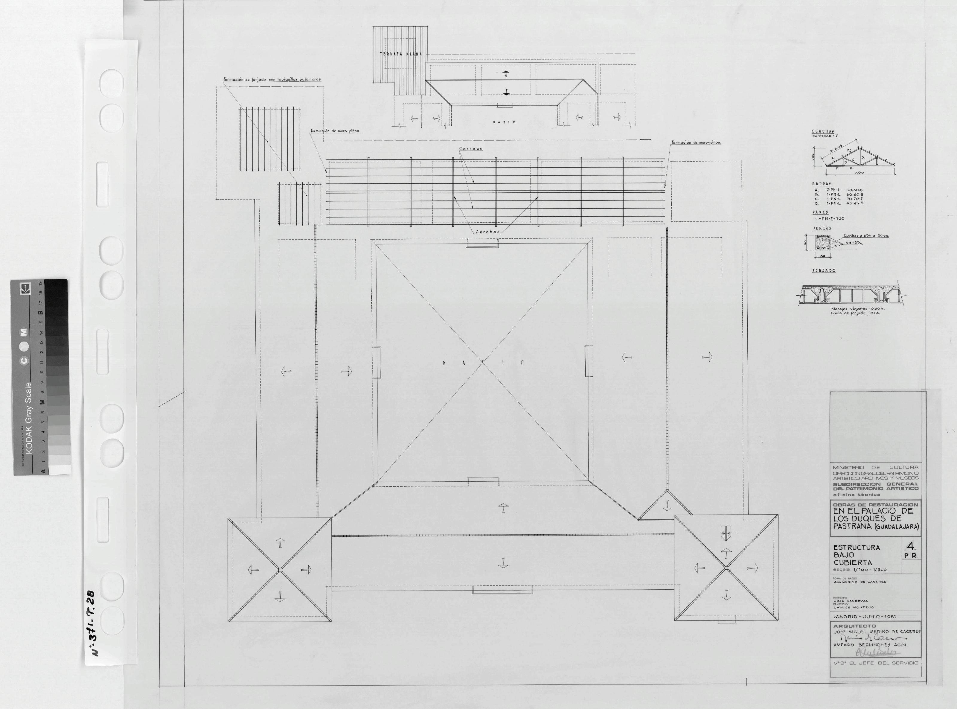 PALACIO DE LOS DUQUES DE PASTRANA - GUADALAJARA-: ESTRUCTURA BAJO CUBIERTAl, plano donde aparece dibujada la planta de cubierta con detalles de cerchas, zuncho , forjado, plano sin cotas.