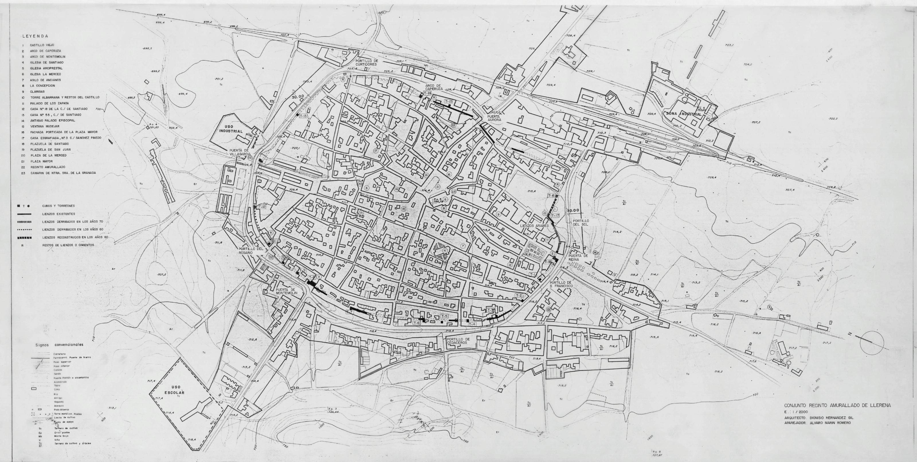 PUERTA DE VILLAGARCIA (RECINTO AMURALLADO) LLERENA. (Badajoz): PLANO DEL RECINTO AMURALLADO Planta del recinto y alrededores con el nombre de las puertas. Sobre plano parcelario indica 23 sitios de interés con número y especifica el nombre en leyenda. Contiene otras leyendas de signos convencionales y de historial de los lienzos. Sin firmar