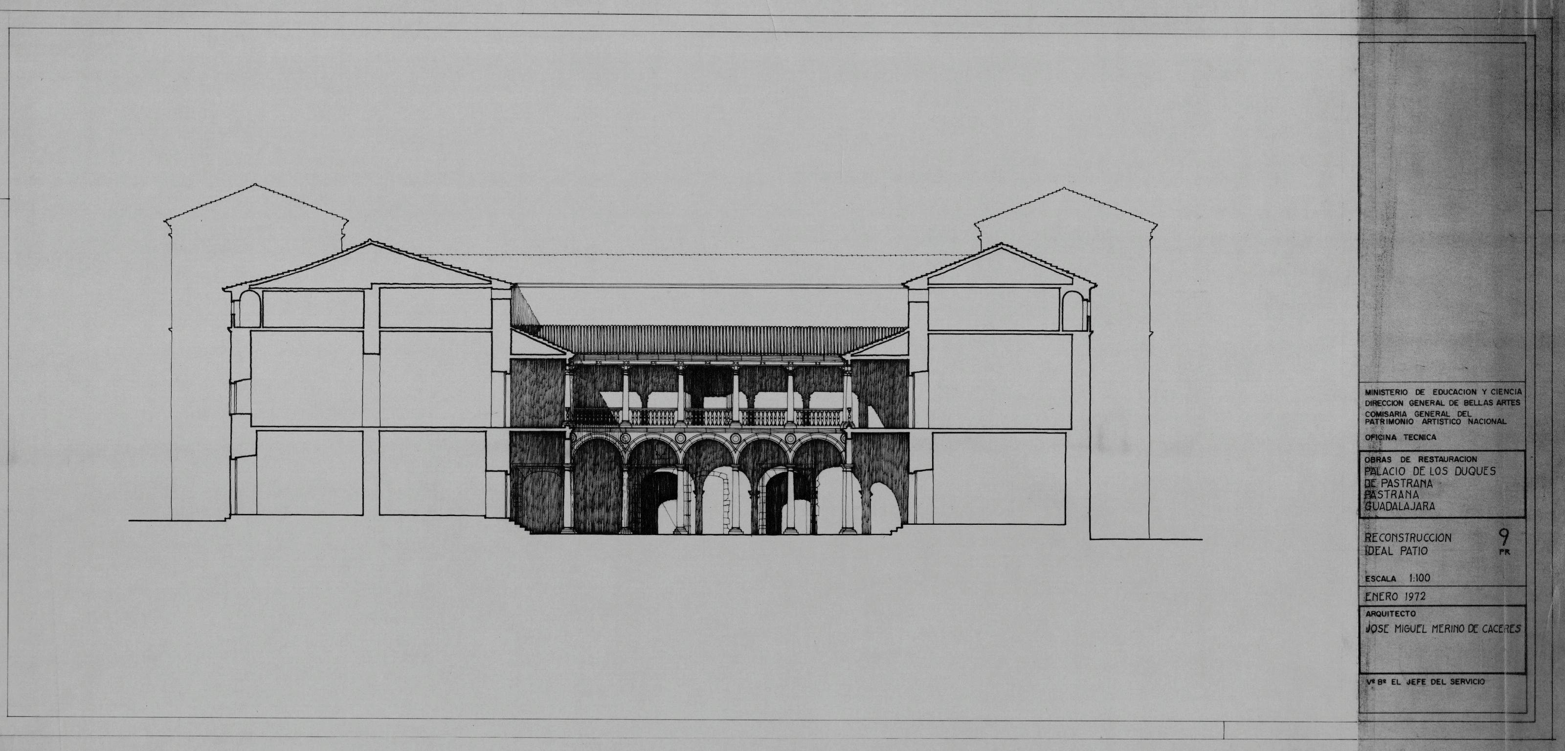 PALACIO DE LOS DUQUES DE PASTRANA - GUADALAJARA-: RECONSTRUCCION IDEAL PATIO. plano donde aparece dibujado la zona a tratar, plano sin cotas.