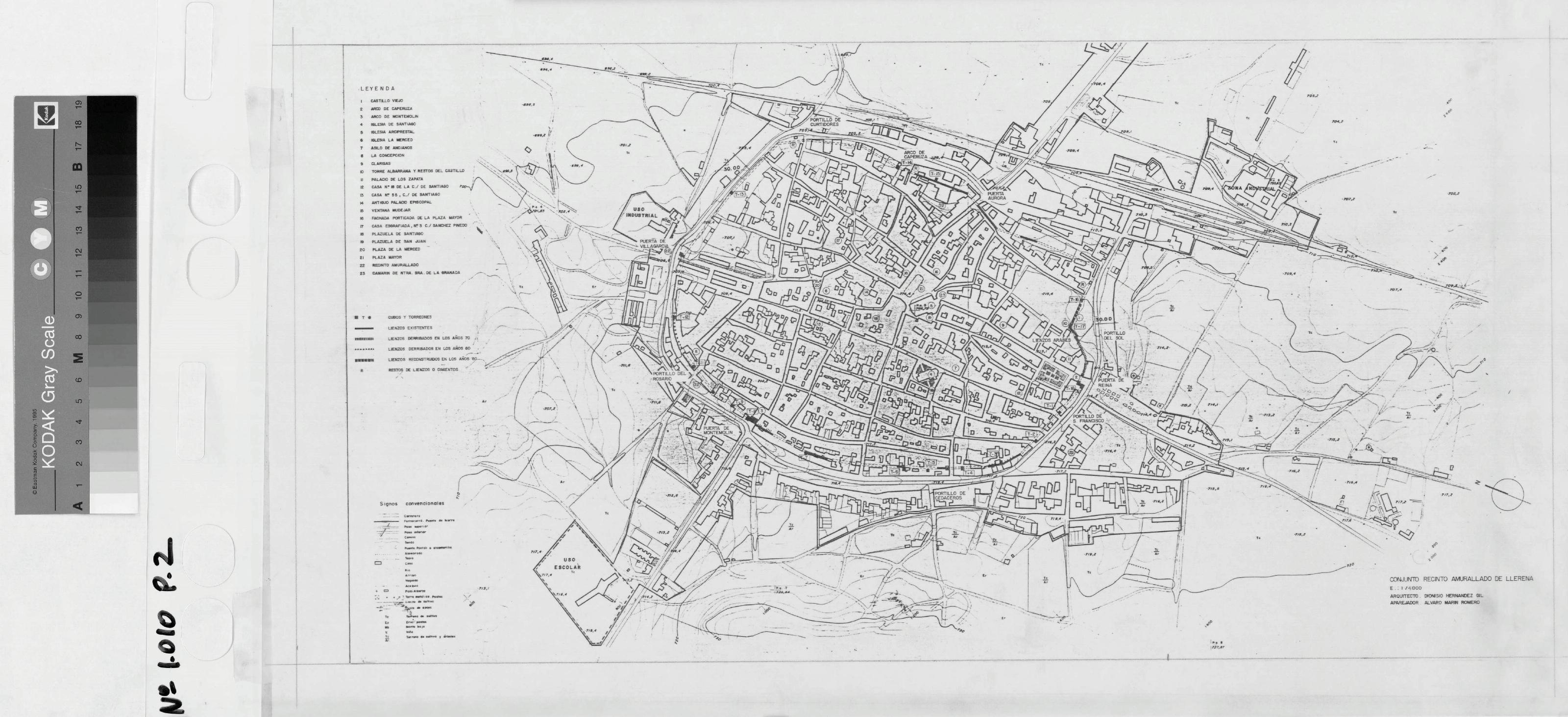 PUERTA DE VILLAGARCIA (RECINTO AMURALLADO) LLERENA. (Badajoz): PLANO DEL RECINTO AMURALLADO (Reducción del plano anterior) Planta del recinto y alrededores con el nombre de las puertas. Sobre plano parcelario indica 23 sitios de interés con número y especifica el nombre en leyenda. Contiene otras leyendas de signos convencionales y de historial de los lienzos. Sin firmar