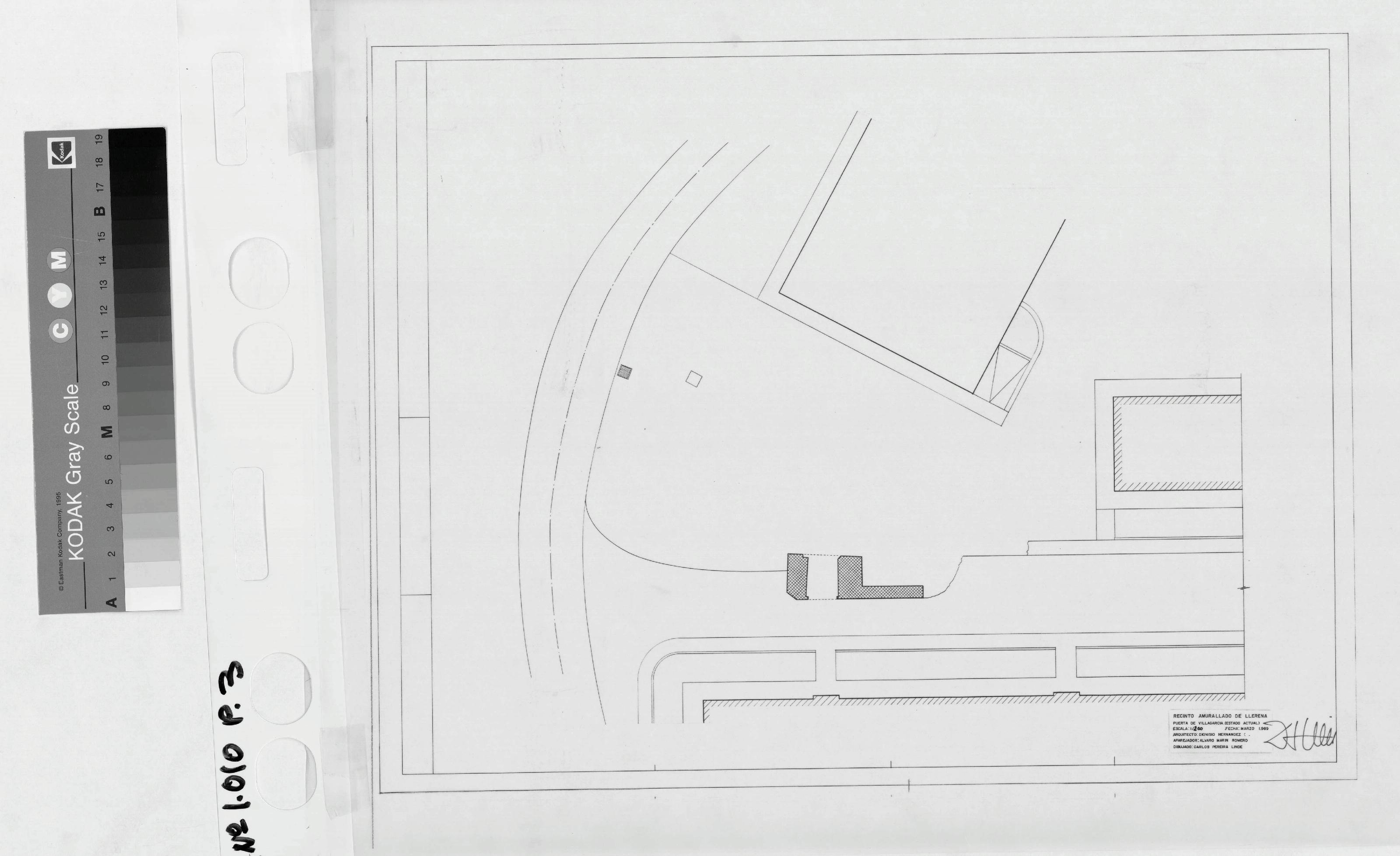 PUERTA DE VILLAGARCIA (RECINTO AMURALLADO) LLERENA. (Badajoz): PLANTA PUERTA DE VILLAGARCIA. (estado actual) Especifica con rayado la situación de la puerta dentro de un entorno reducido. Sin cotas ni notas y firmado