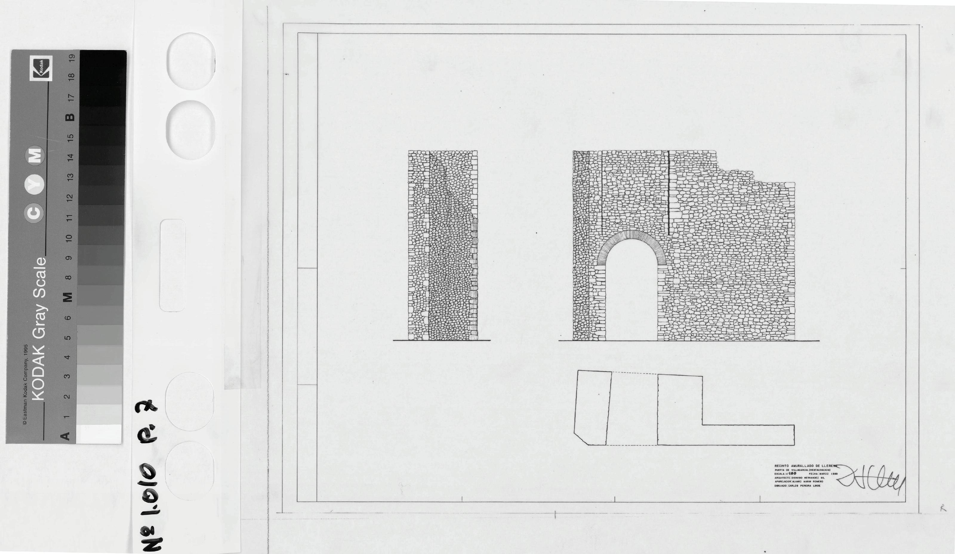 PUERTA DE VILLAGARCIA (RECINTO AMURALLADO) LLERENA. (Badajoz): PLANTA y ALZADOS PUERTA DE VILLAGARCIA. (restauración) Con representación de mamposterías y terminaciones con buen detalle. Sin cotas ni notas y firmado.