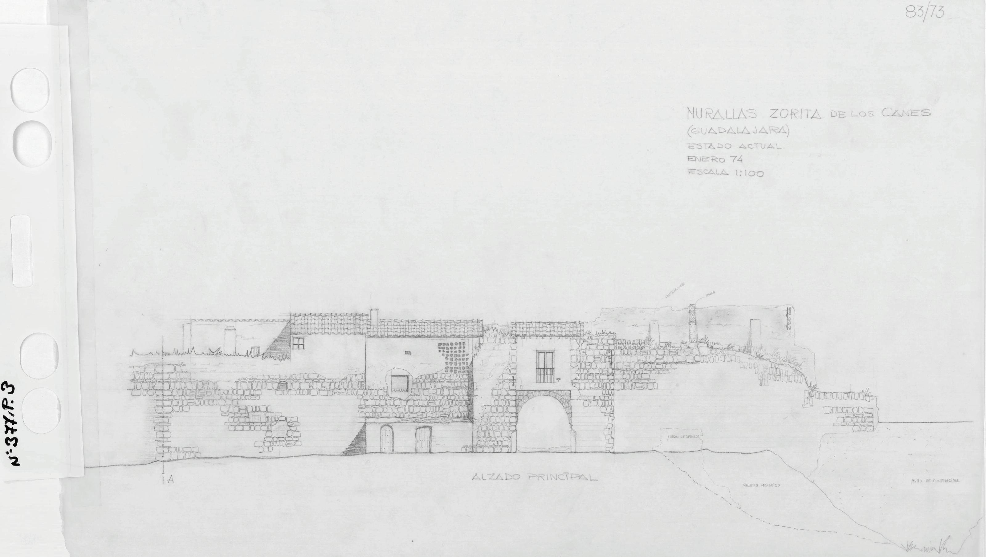 MURALLA DE ZORITA de los CANES - GUADALAJARA-: ALZADO PRINCIPAL, ESTADO ACTUAL, Plano dibujado a lapiz , con descripcion de algunas viviendas cercanas al muro de contencion de la muralla, plano sin cotas.