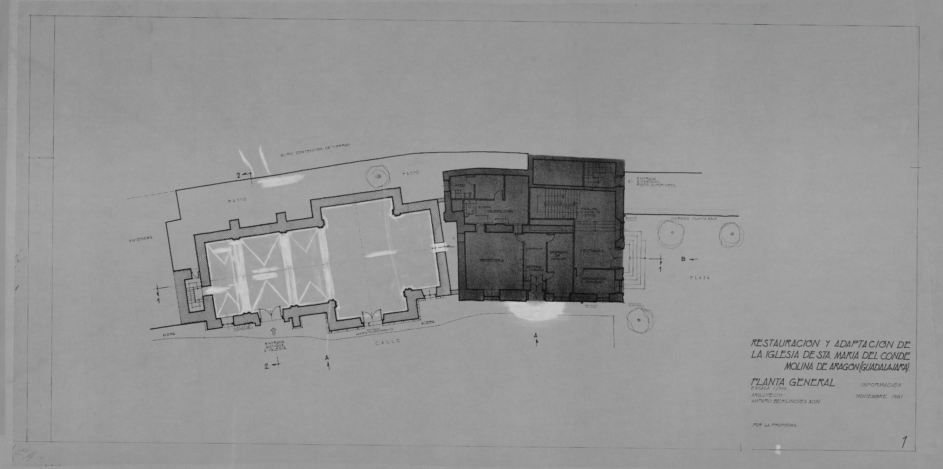 IGLESIA DE SANTA MARIA DEL CONDE - MOLINA DE ARAGON - GUADALAJARA -: PLANTA GENERAL, Planta general de la iglesia, marca una zona donde se actuara, plano sin cotas
