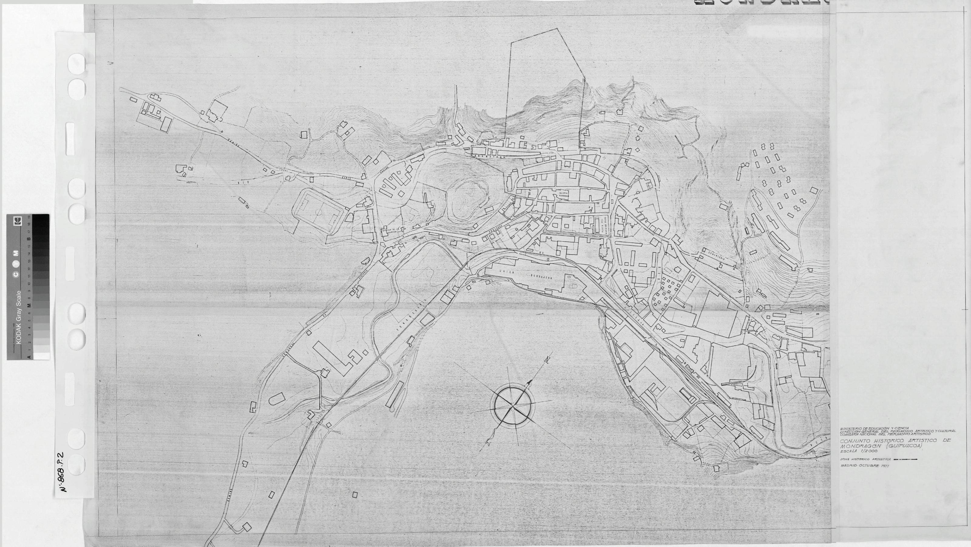 CONJUNTO HISTORICO ARTISTICO DE MONDRAGÓN (Guipúzcoa): ZONA HISTORICO ARTISTICA Marca sobre 2 copias de planos parcelarios empalmados con línea de puntos gruesa el resto del perímetro del casco antiguo de la ciudad que le falta al plano anterior. Contiene nomenclatura de calles y sitios.