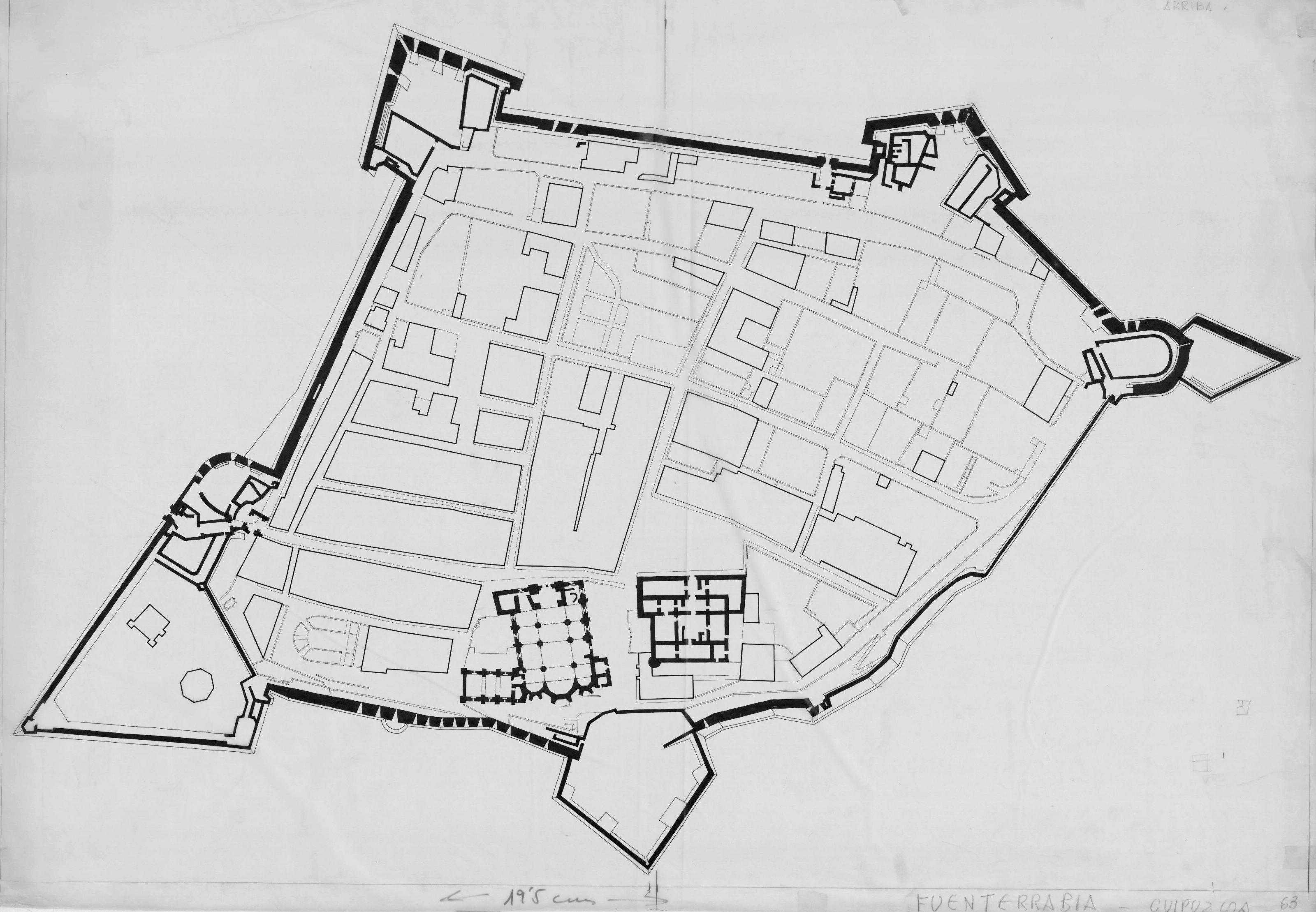 CASTILLO DE CARLOS V FUENTERRABIA (Guipúzcoa): PLANTA Representa las murallas del casco antiguo con sus baluartes y los solares intramuros incluidas las plantas de distribución de dos sitios de interés uno de ellos el castillo. Sin notas ni cotas y sin firmar.