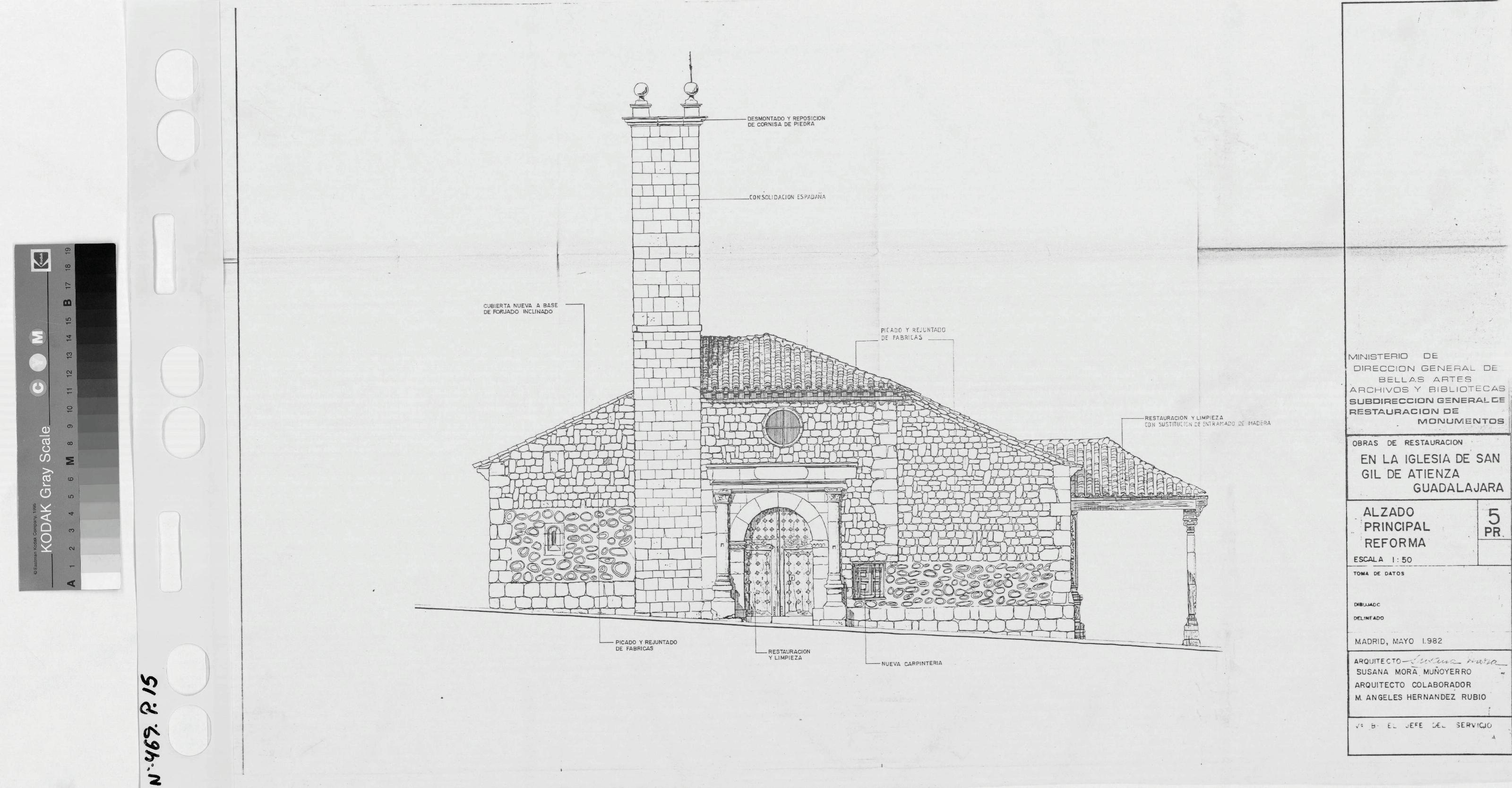 IGLESIA DE SAN GIL - ATIENZA - GUADALAJARA -: ALZADO PRINCIPAL, reformado señala en el plano las labores a realizar plano sin cotas,