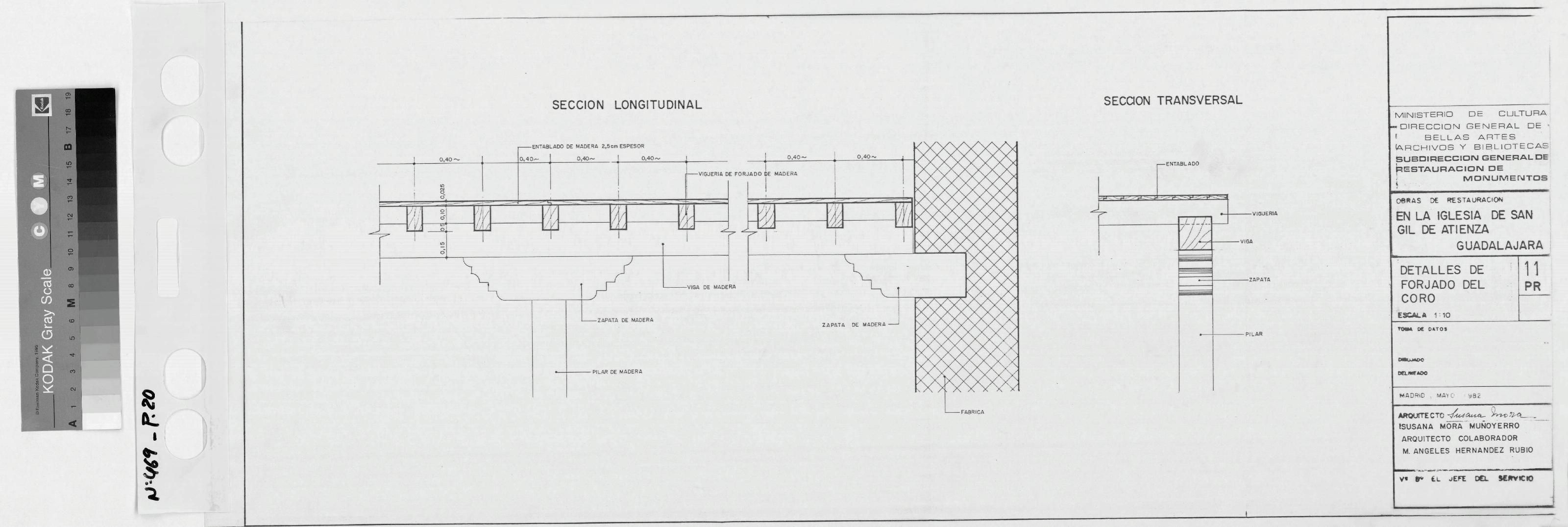 IGLESIA DE SAN GIL - ATIENZA - GUADALAJARA -: DETALLE DE FORJADO DEL CORO, seccion longitudinal y transversal, plano acotado.