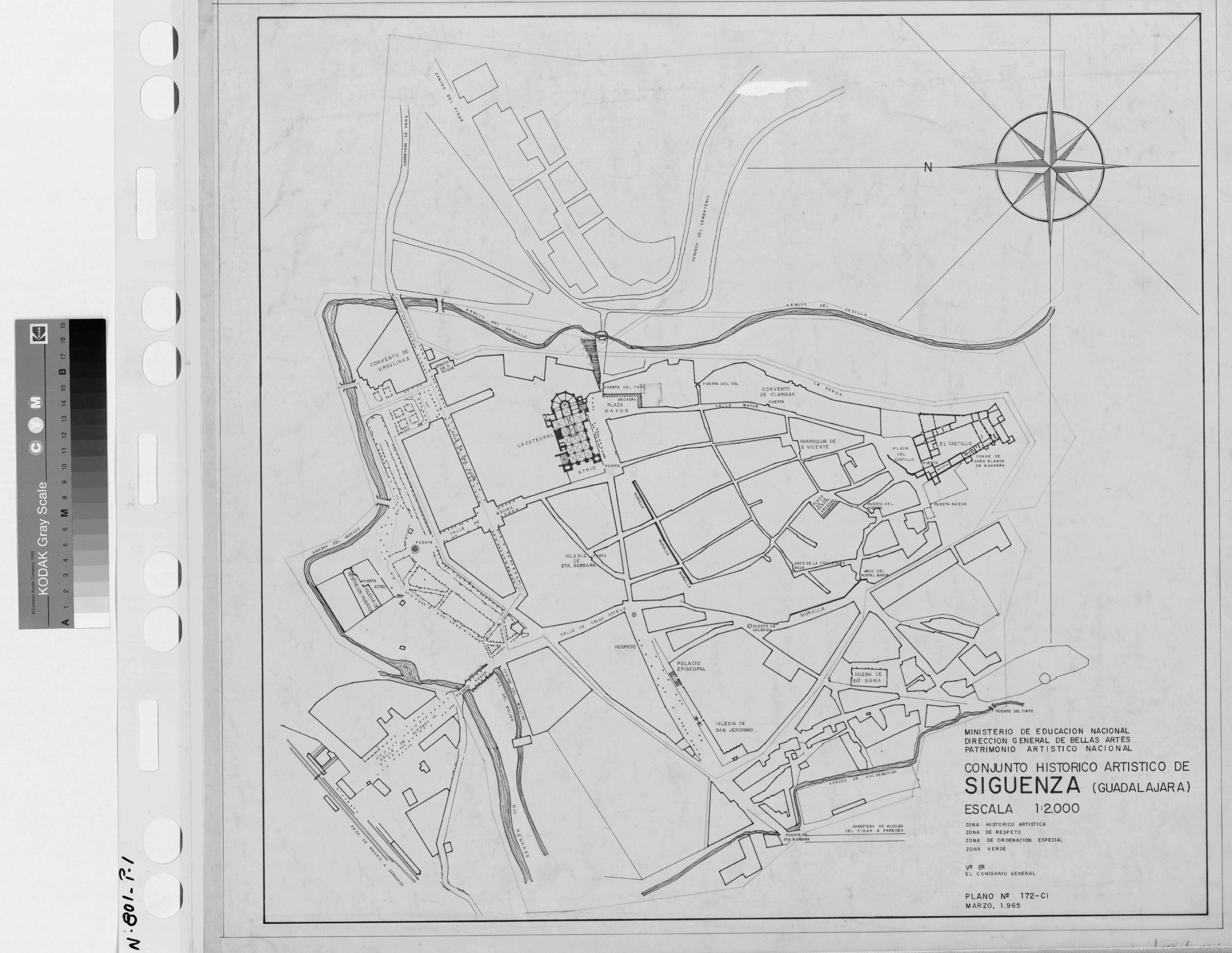 CONJUNTO HISTORICO ARTISTICO DE SIGUENZA -GUADALAJARA -: PLANO GENERAL DEL CONJUNTO, En este plano de conjunto nos señala varias zonas a tratar : historico-artistico, de respeto , de ordenacion especial y de zona verde. Ademas situa algunos monumentos, plano sin cotas.