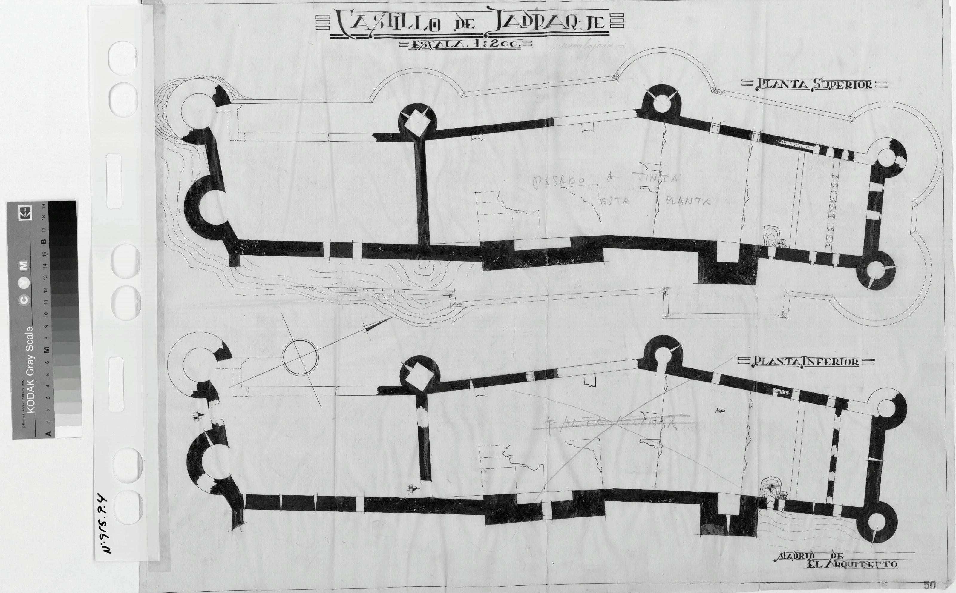 CASTILLO DE JADRAQUE - GUADALAJARA -: PLANTA SUPERIOR Y PLANTA INFERIOR, En este plano vemos dibujado parte de la muralla, y los muros sombreados de la planta, plano sin cotas.