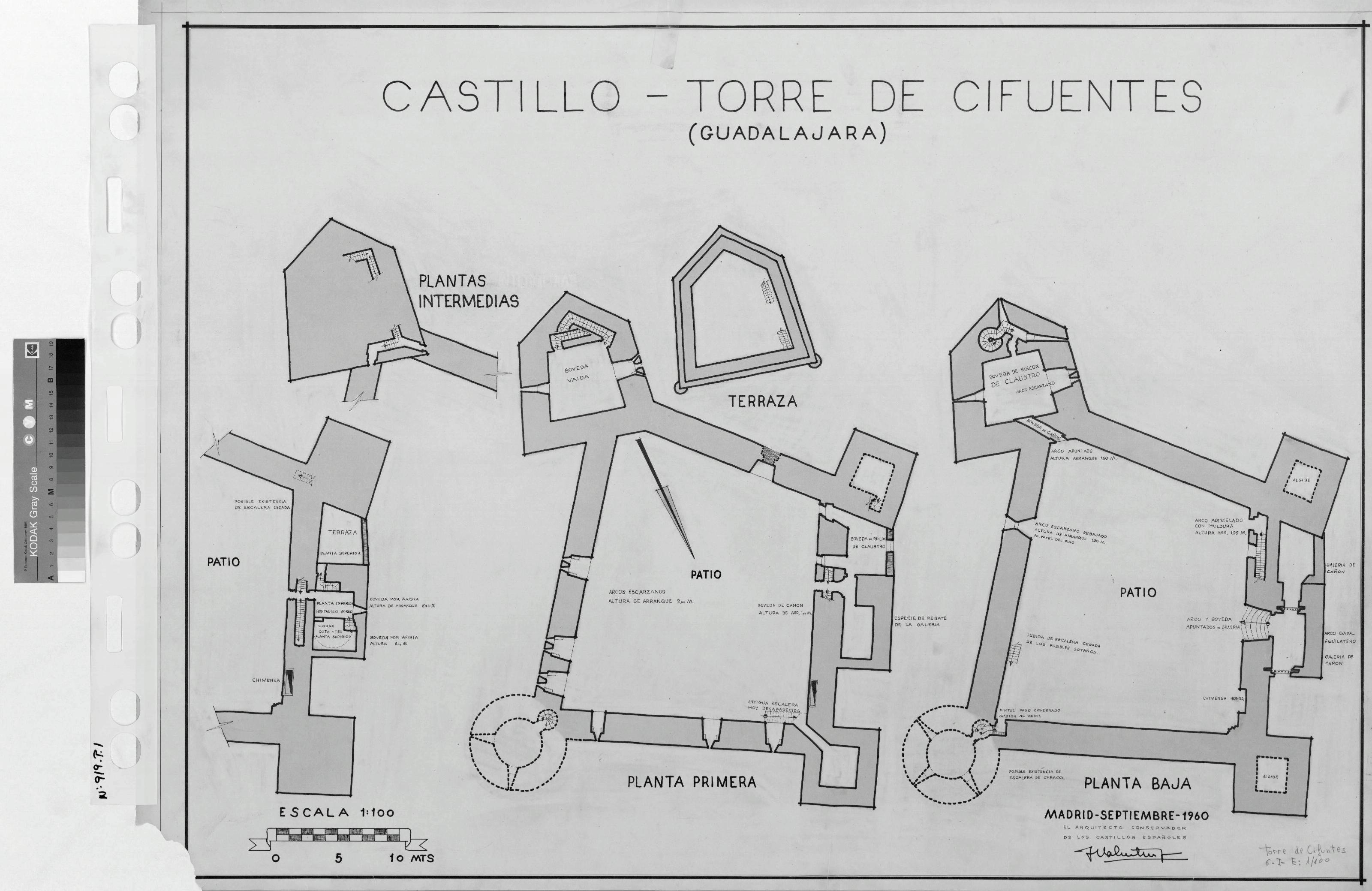CASTILLO DE TORRE DE CIFUENTES - GUADALAJARA -: PLANTAS : BAJA ,PRIMERA, ENTREPLANTAS, En este plano vemos dibujado los muros sombreados de las plantas , y nos señala algunos elementos constructuvos del castillo, plano sin cotas.