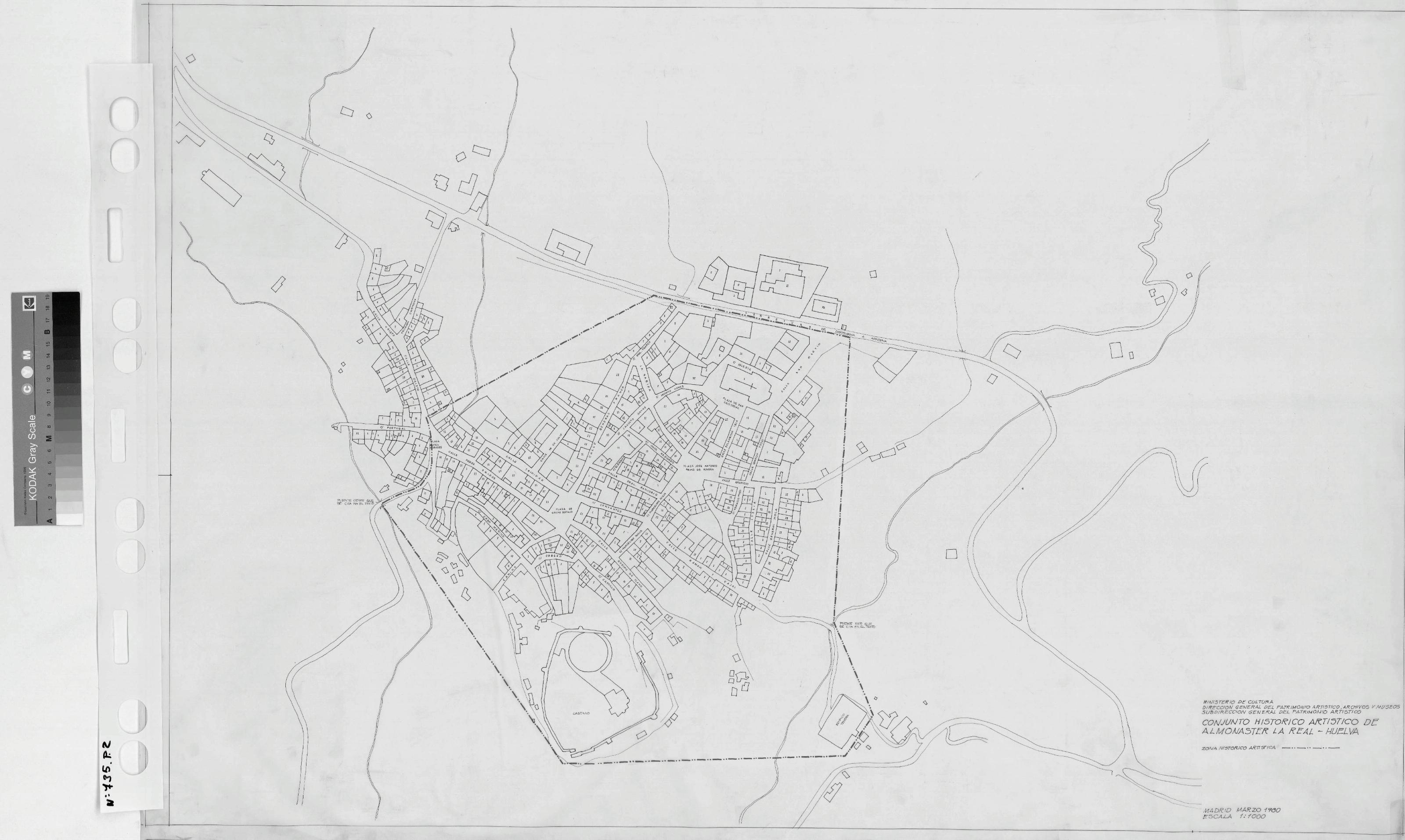 CONJUNTO HISTORICO ARTISTICO DE ALMONASTER LA REAL (Huelva): PLANO GENERAL Con carreteras y caminos de acceso y con nomenclatura de calles así como delimitación de solares con nº de alturas construidas. Marca la delimitación del conjunto histórico. Más completo que el anterior con nomenclatura también de algunos sitios de interés y diversas notas Sin firmar.