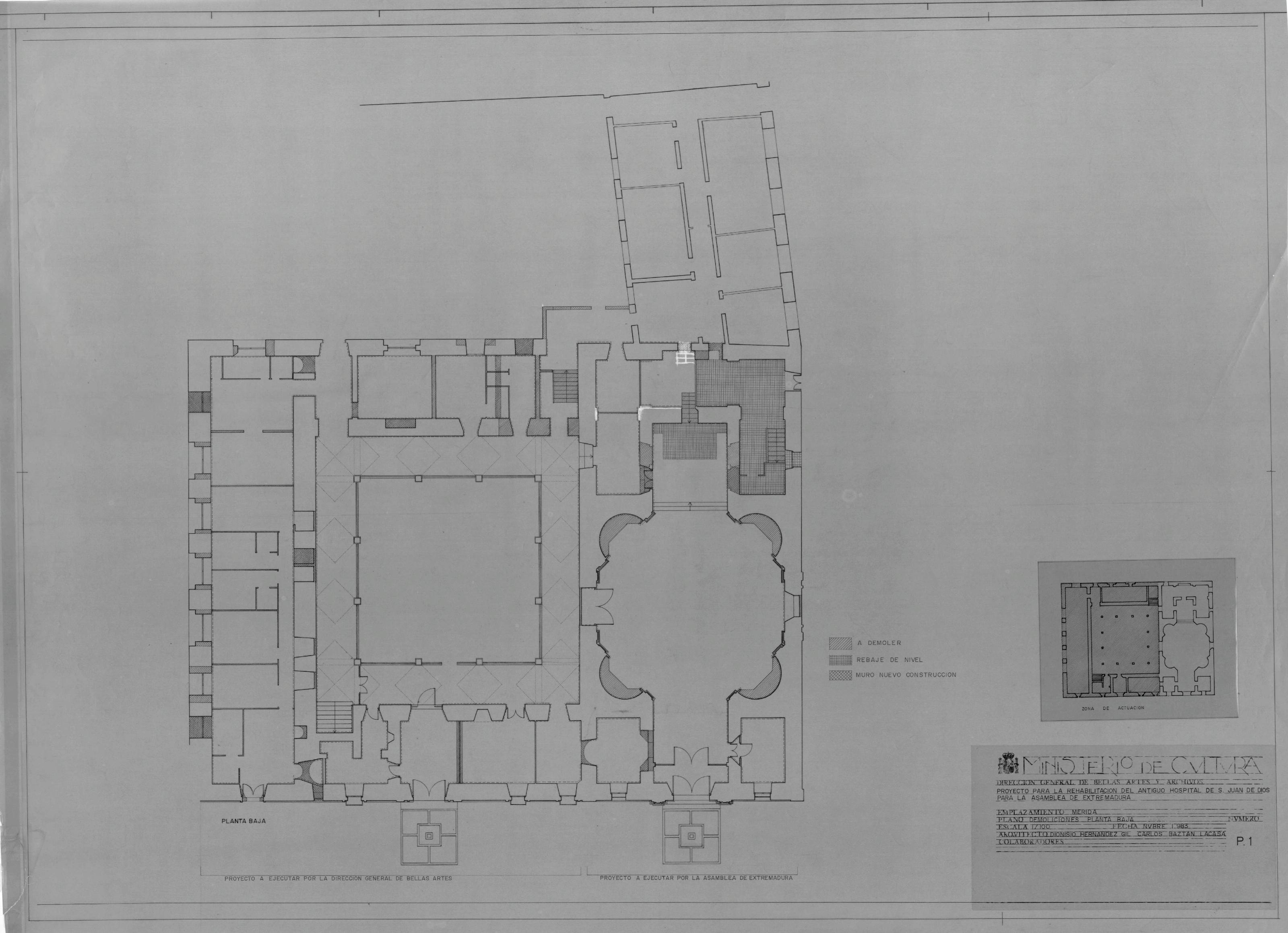 ASAMBLEA DE EXTREMADURA PROYECTO DE REHABILITACIÓN DEL ANTIGUO HOSPITAL DE S. JUAN DE DIOS PARA SEDE DE LA ASAMBLEA: PLANTA BAJA - DEMOLICIONES Especificando con rayados zonas a demoler, rebajes de nivel y muros de nueva construcción asi como la zona de proyecto correspondiente a D.G.B.B.A.A. Y a la Asamblea de Extremadura Sin firmar