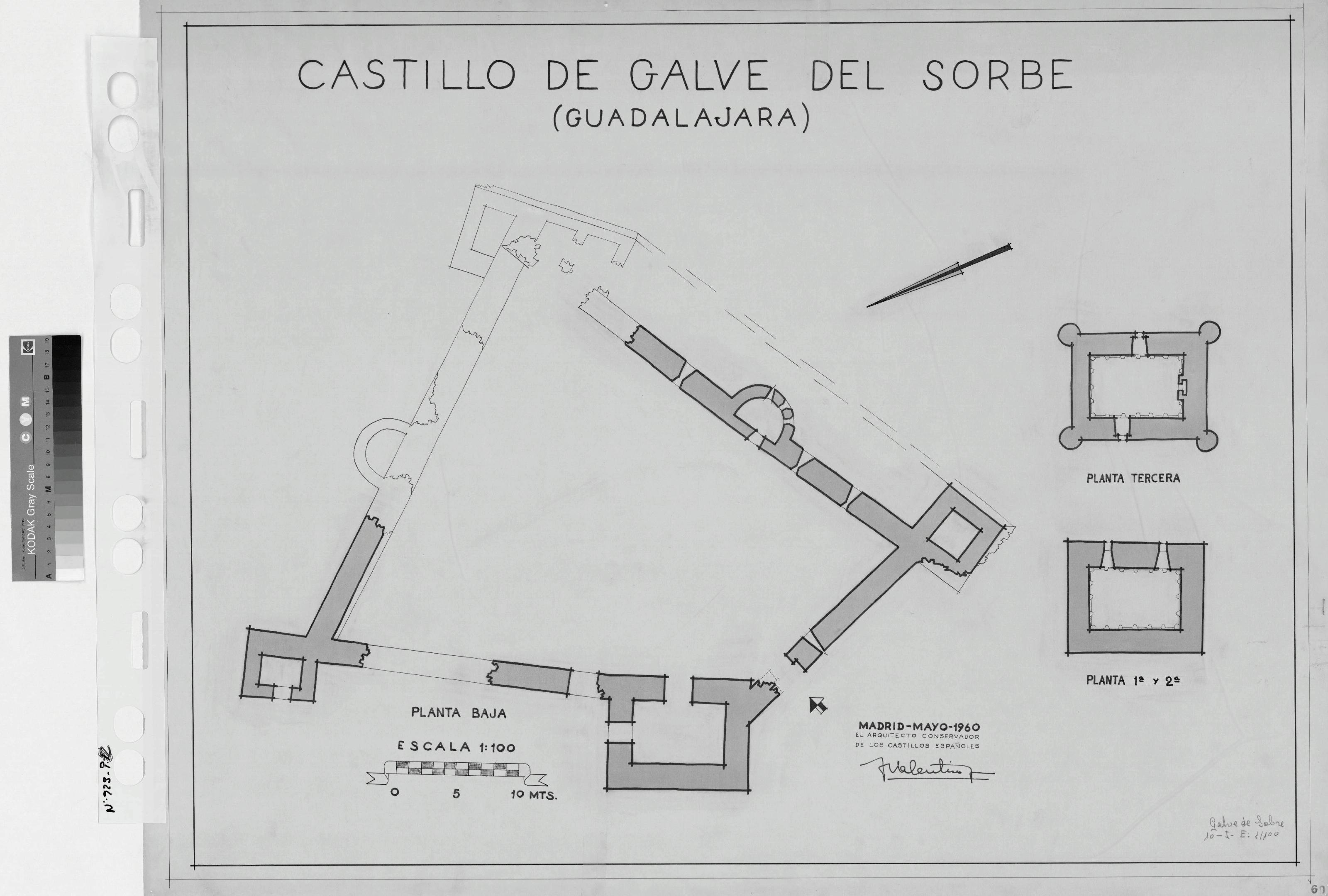 CASTILLO DE GALVE DEL SORBE - GUADALAJARA-: PLANTA GENERAL Plano, donde aparecen dibujadas varias plantas, como planta baja, primera , segunda y tercera con muros regruesados y sombreados, plano sin cotas.