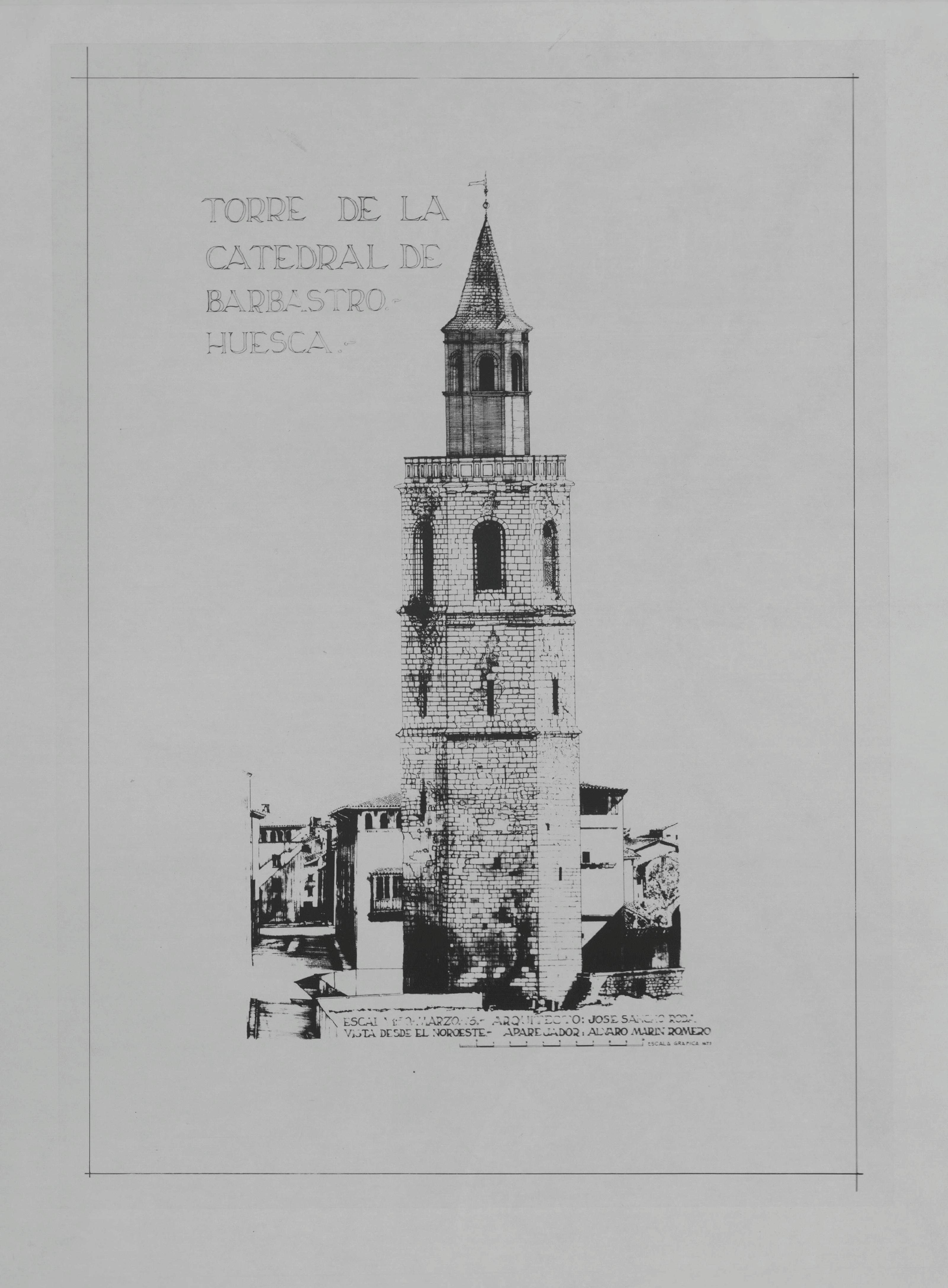 CATEDRAL DE BARBASTRO TORRE - HUESCA-: ALZADO, VISTA DESDE EL NORESTE, Plano reducido, alzado de la torre , dibujado con detalle, plano sin cotas.