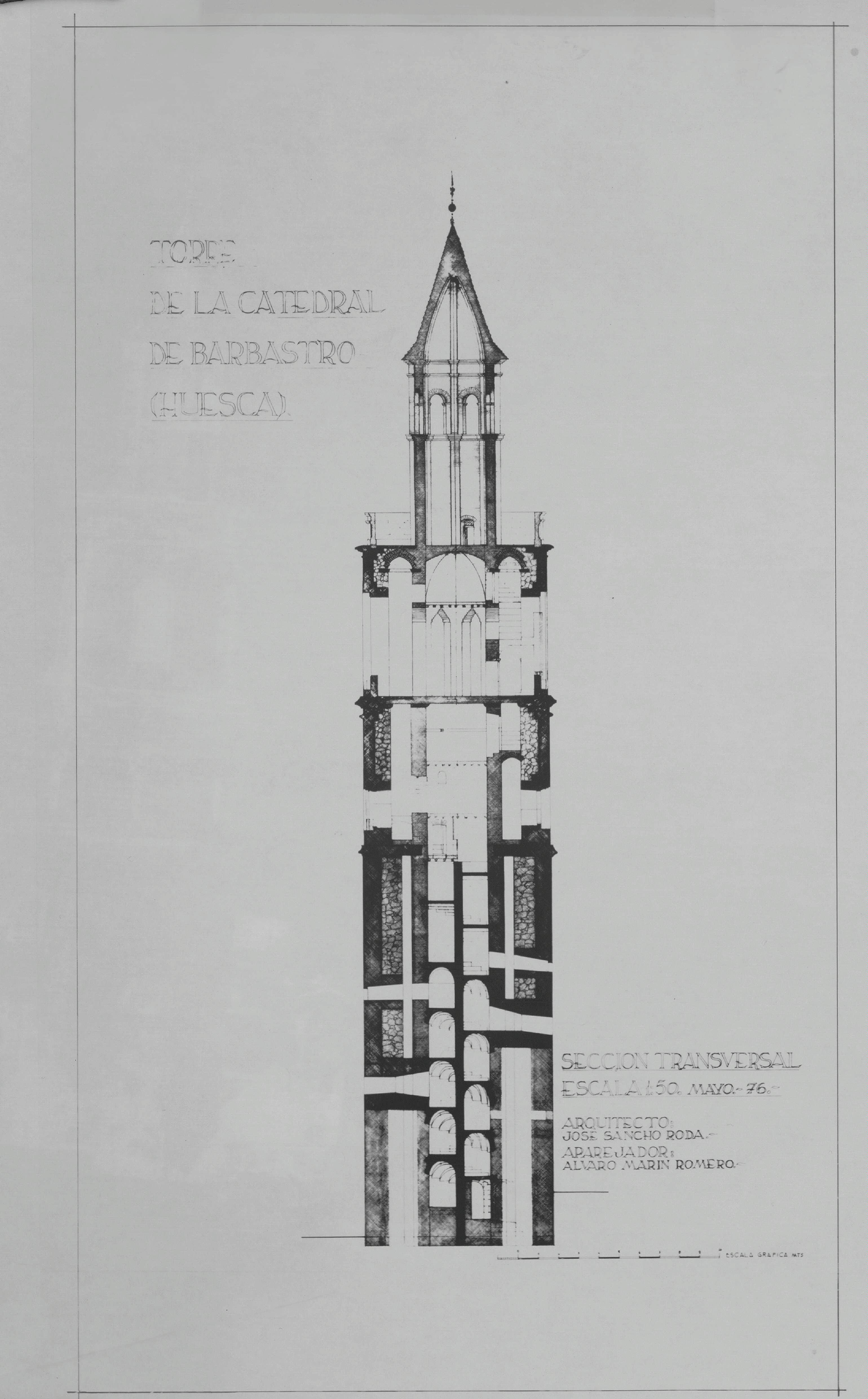 CATEDRAL DE BARBASTRO TORRE - HUESCA-: SECCION TRANSVERSAL, Plano reducido, seccion de la torre , dibujado con detalle, plano sin cotas.