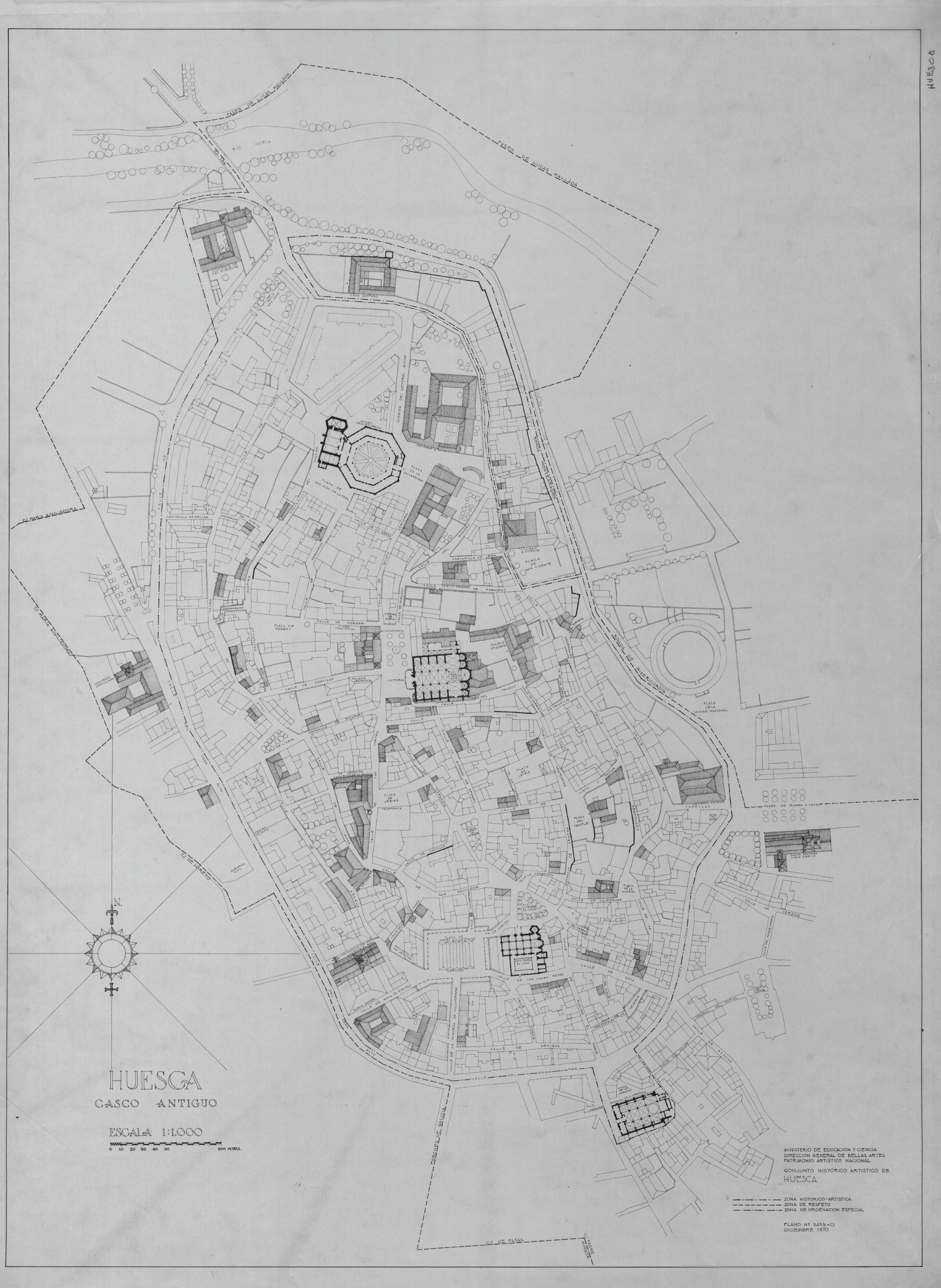 CONJUNTO HISTORICO ARTISTICO DE - HUESCA-: PLANO GENERAL DEL CONJUNTO , Plano de situacion , marca zonas, una de respeto y otra historica artistica, y otra de ordenacion especial, plano sin cotas.