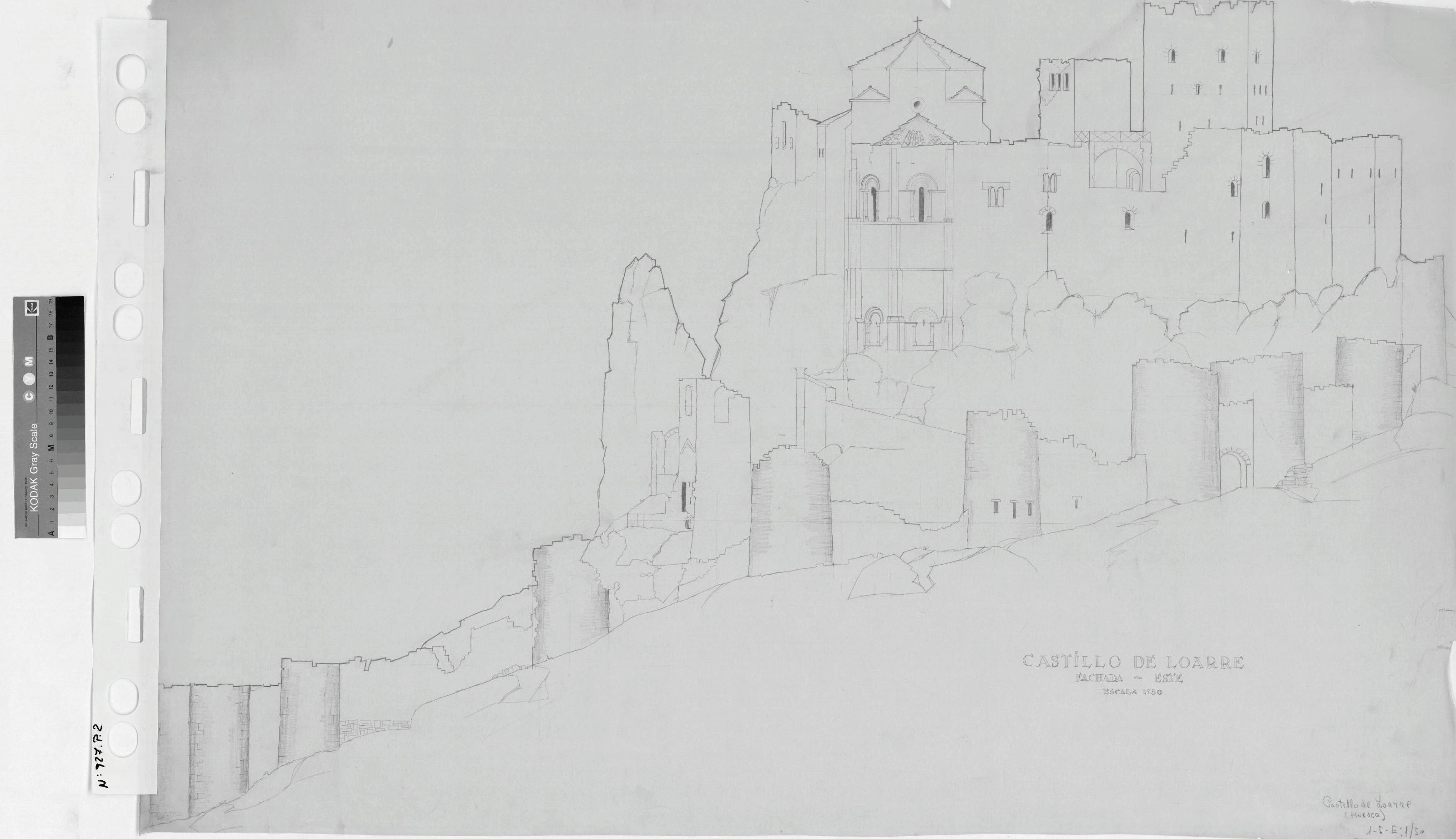 CASTILLO DE LOARRE - HUESCA-: FACHADA ESTE. Plano dibujado a lapiz en papel vegetal, dibujo sin acotar.