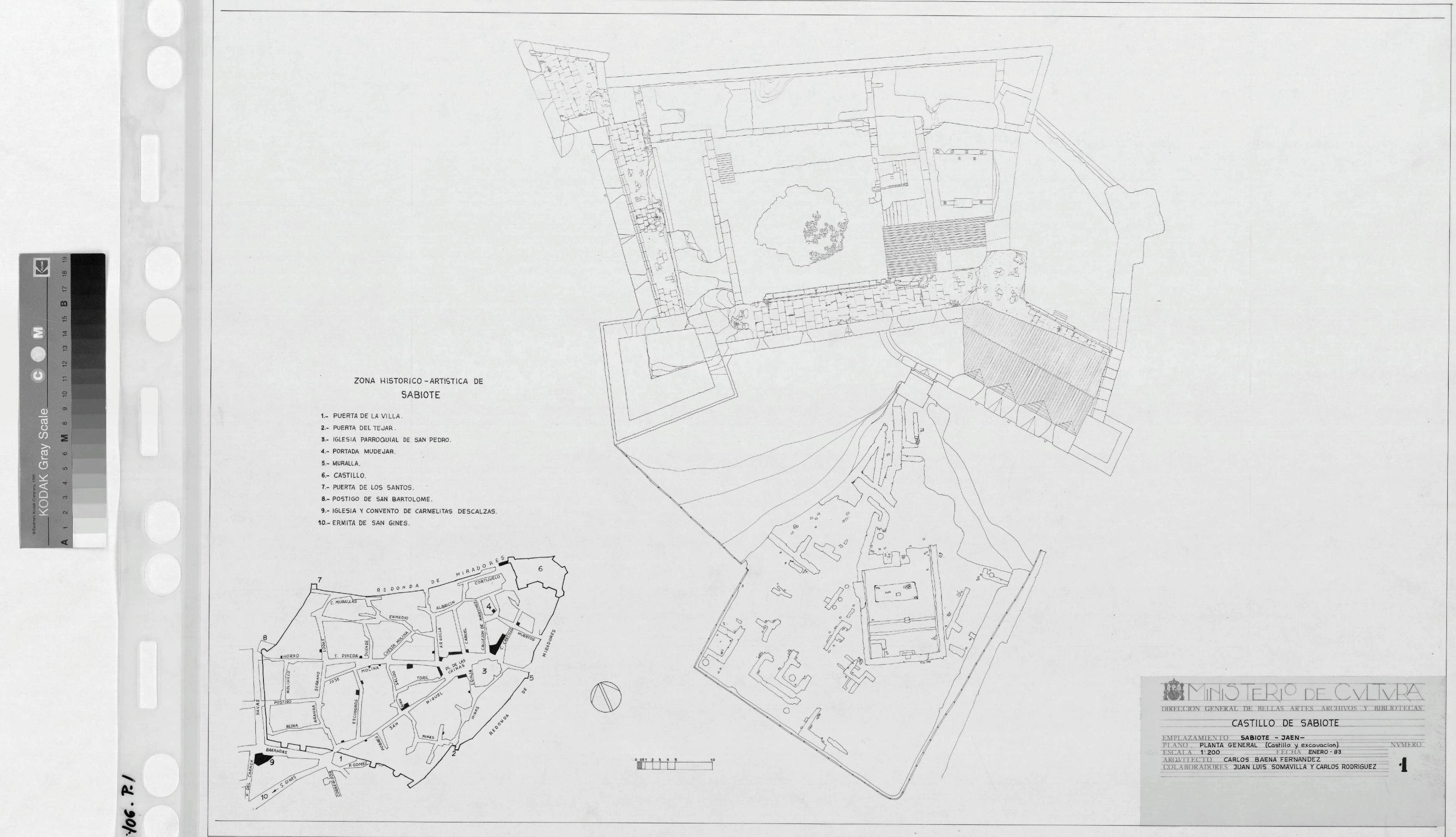 CASTILLO DE SABIOTE - JAEN -: PLANTA GENERAL ( CASTILLO Y EXCAVACIONES) . Plano , donde aparece una representacion de una zona historica artistica de Sabiote, y una planta del castillo, plano sin cotas.