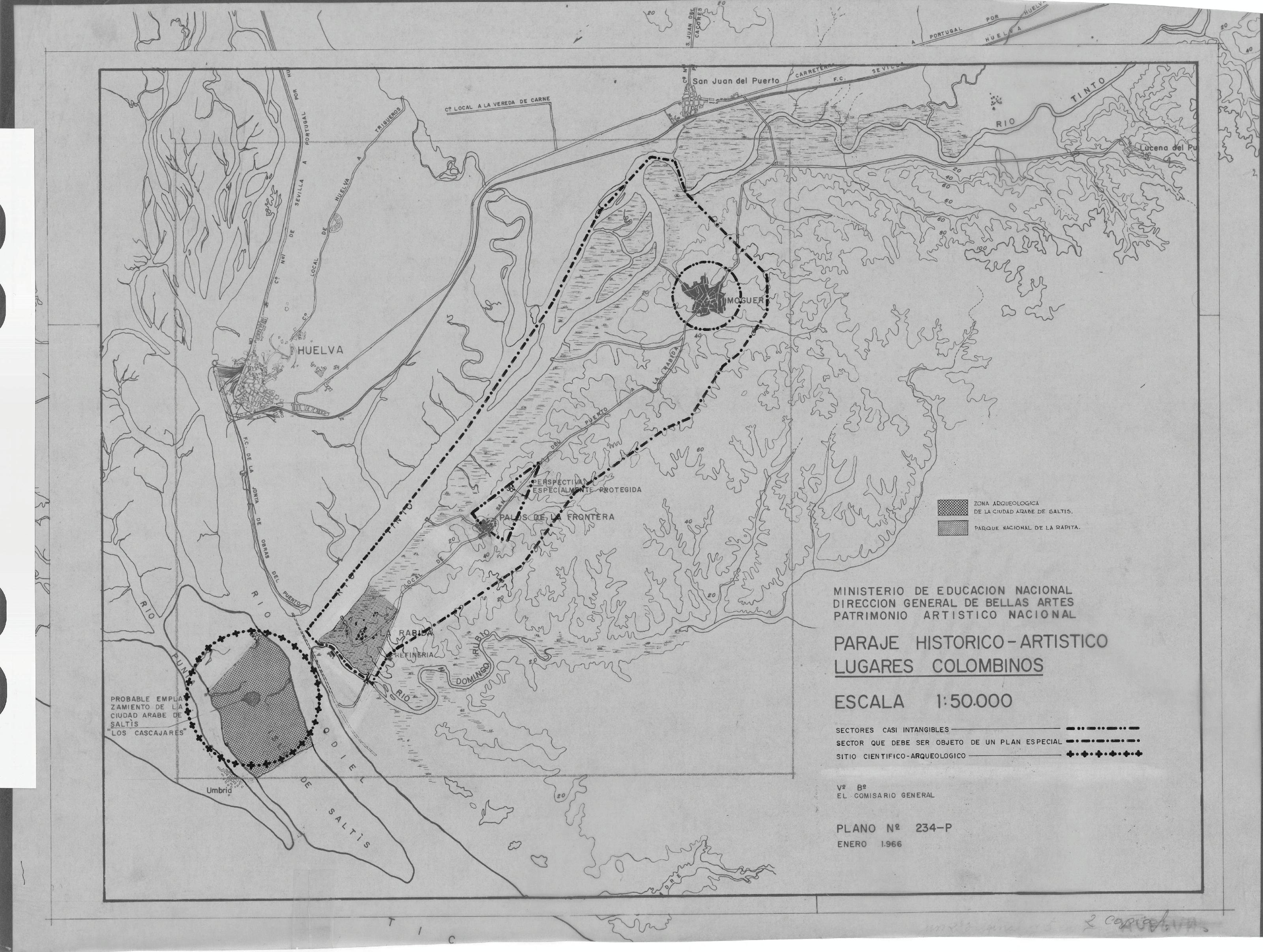 CONJUNTO HISTORICO ARTISTICO DE HUELVA: PARAJE HISTORICO ARTISTICO - LUGARES COLOMBINOS Indica con diferentes tramados lo que es zona arqueológica y parque nacional e indica también con diferentes contornos, sectores de diferentes tratamientos. Pone en sello plano nº 234-P