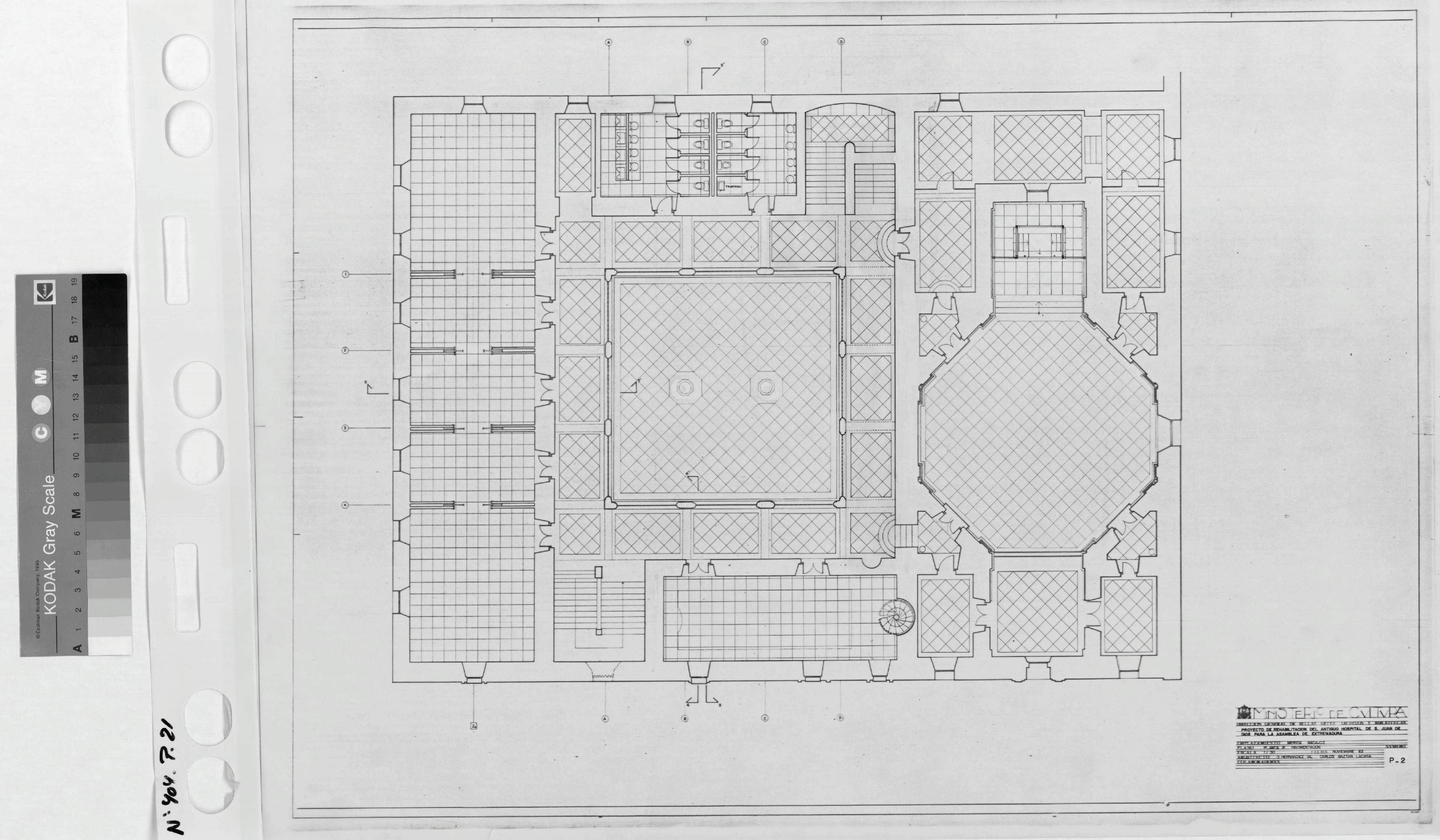 ASAMBLEA DE EXTREMADURA PROYECTO DE REHABILITACIÓN DEL ANTIGUO HOSPITAL DE S. JUAN DE DIOS PARA SEDE DE LA ASAMBLEA: PLANTA PRIMERA PAVIMENTACION Con despiece de solados en todas las estancias Con Líneas de sección 3-3¿, 4-4¿ y 5-5¿ y varias llamadas con letra y círculo en fachada. Sin firmar