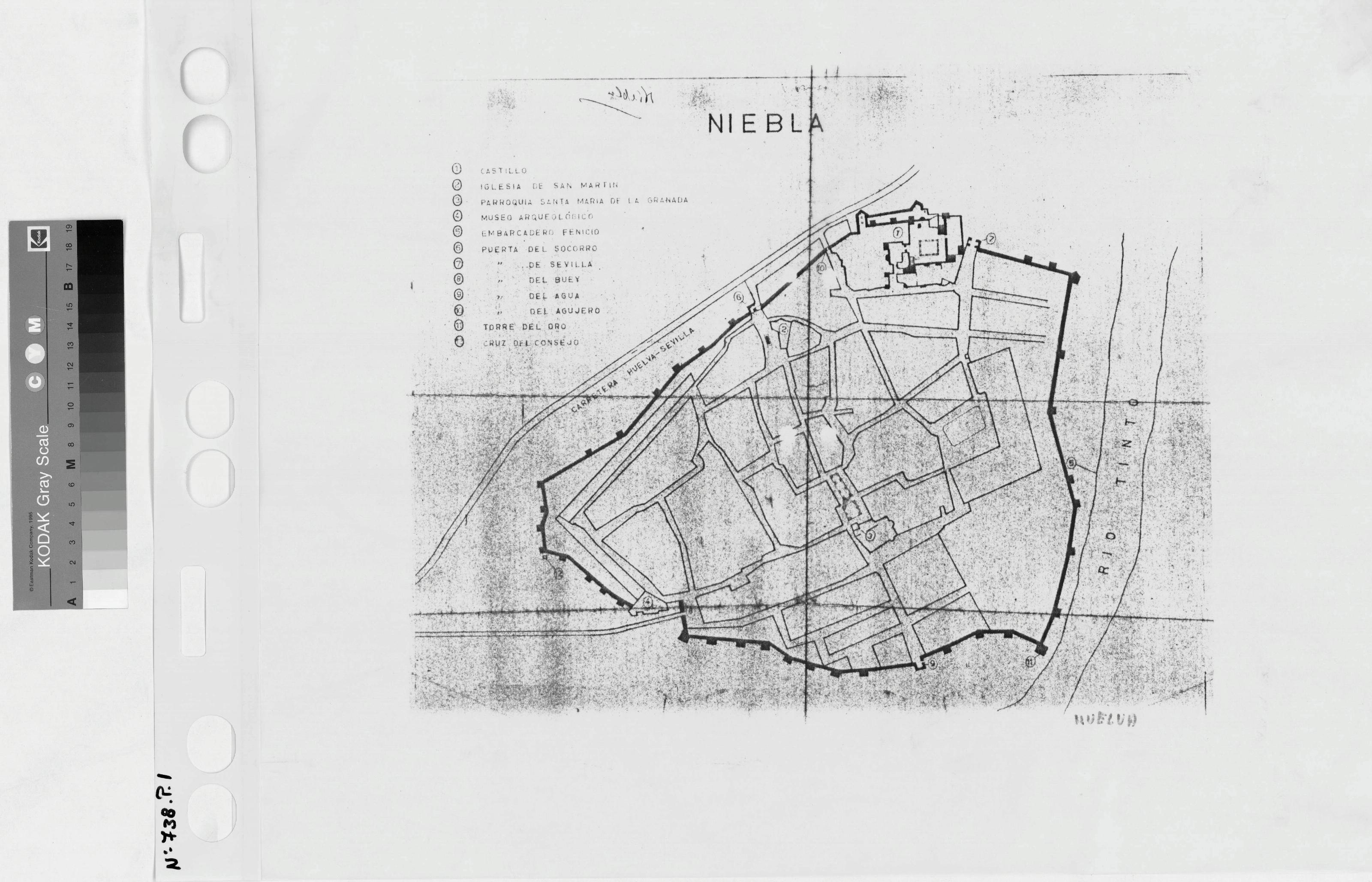 CONJUNTO HISTORICO ARTISTICO DE NIEBLA (Huelva): NIEBLA Ordenación de calles intramuros y situación entre carretera y rio Tinto señala 12 sitios de interés y especifica los nombres en leyenda.