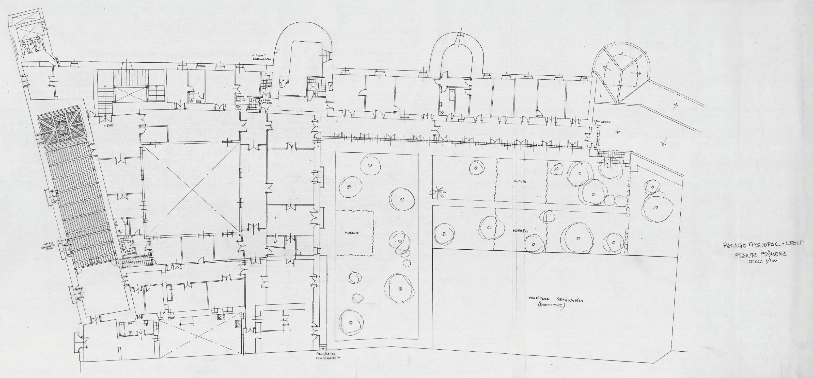 PALACIO EPISCOPAL DE LEON: PLANTA PRIMERA Con alguna nota, también incluye zona de huerta y propiedades del seminario. Refleja artesonados en zona de portería. Sin sello y sin firmar