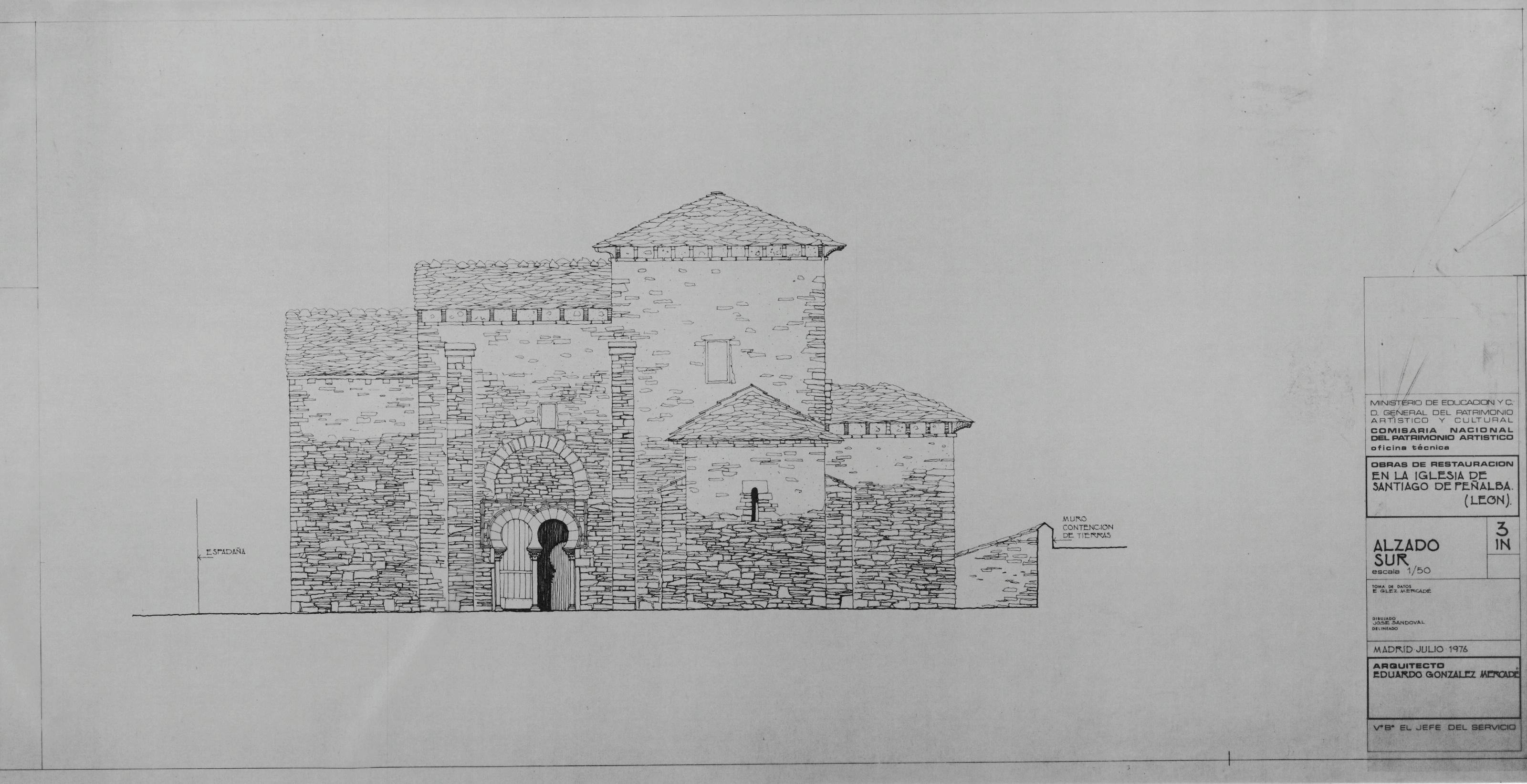 IGLESIA DE SANTIAGO DE PEÑALBA - LEON- (integrado en el proyecto de la IGLESIA DE SANTA MARIA DEL MERCADO): ALZADO SUR Con despieces de piedra y teja y alguna sombra. Sin firmar.