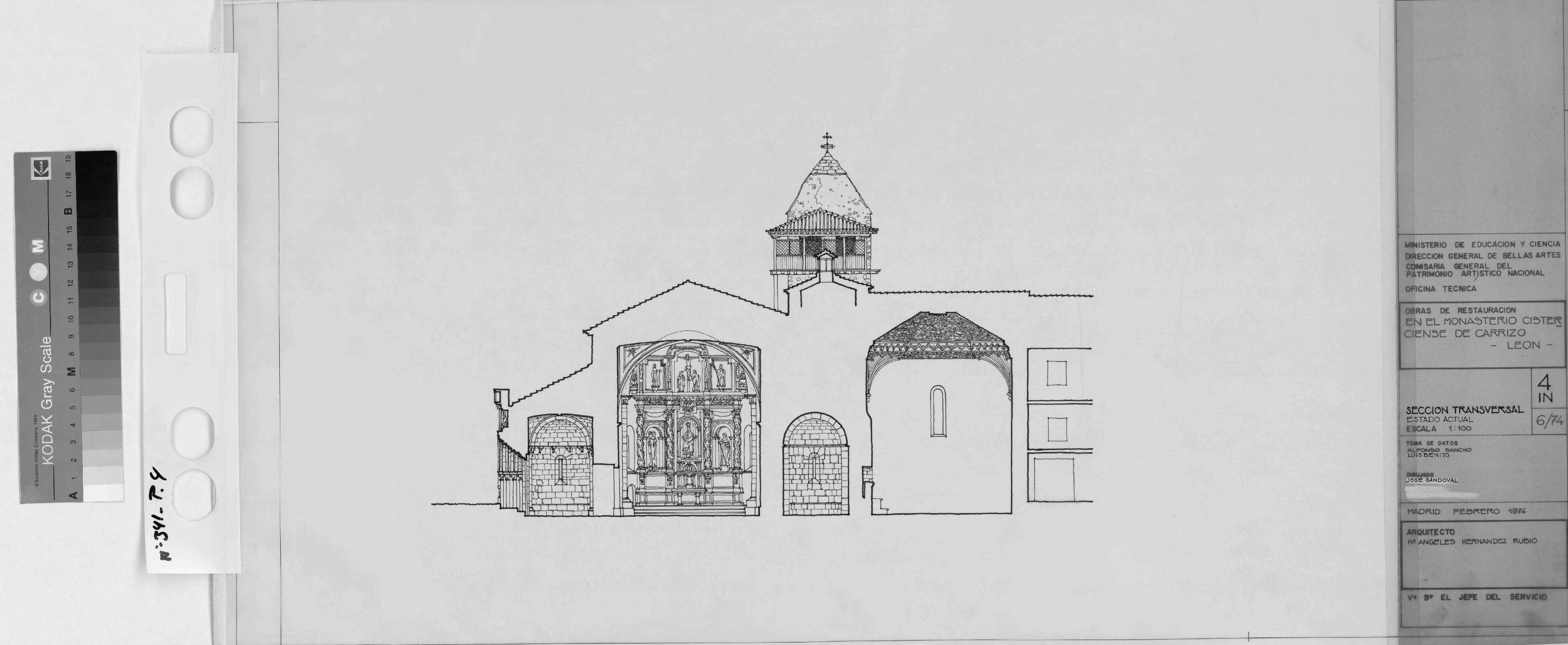 OBRAS DE RESTAURACION EN EL MONASTERIO CISTERCIENSE DE CARRIZO - LEON -: SECCION TRANSVERSAL - Estado ActualCon despieces, rayados y sombras y dibujo de retablo y artesonado. Sin cotas ni notas. Sin firmar