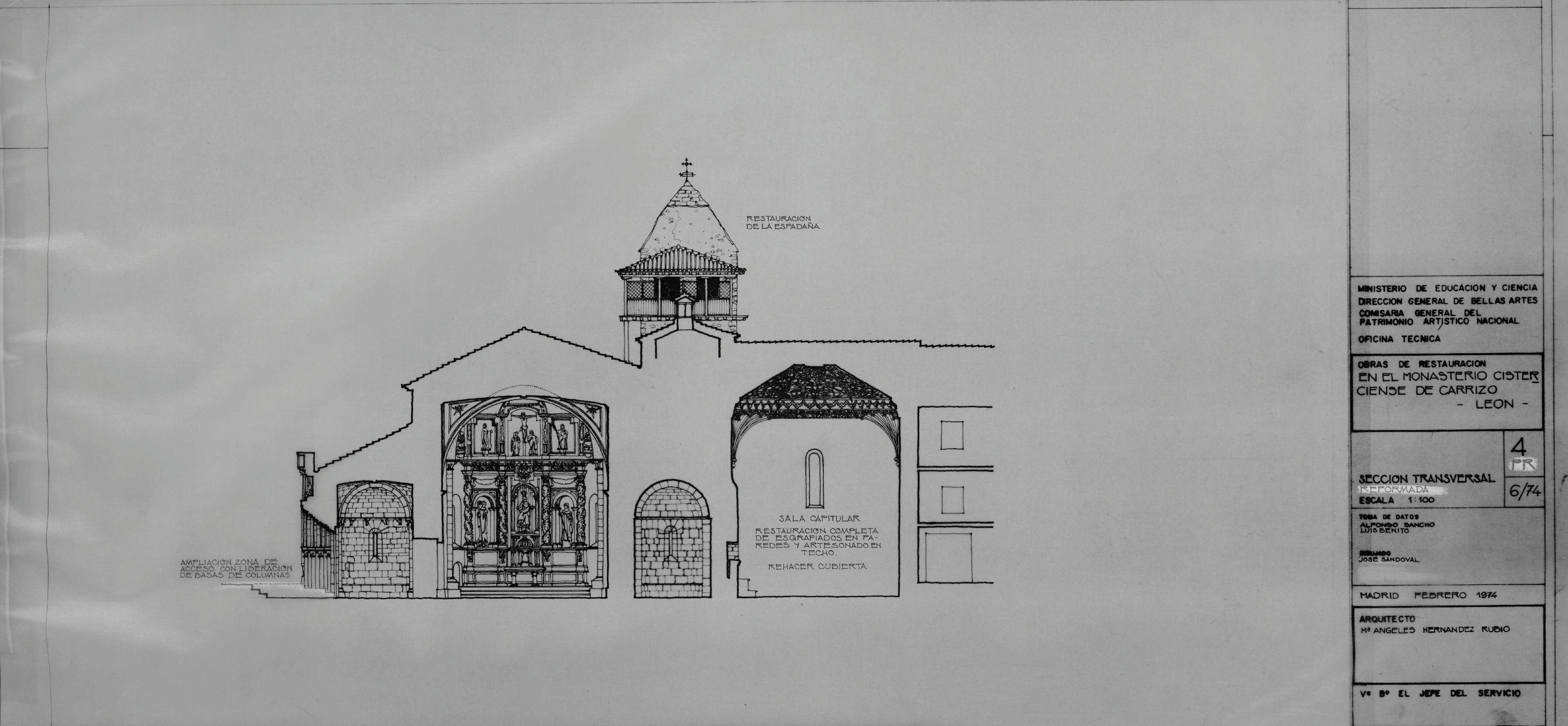 OBRAS DE RESTAURACION EN EL MONASTERIO CISTERCIENSE DE CARRIZO - LEON -: SECCION TRANSVERSAL - ReformadaCon 4 notas relativas a zonas de actuación en esta restauraciónCon despieces, rayados y sombras y dibujo de retablo y artesonado. Sin cotas ni notas. Sin firmar