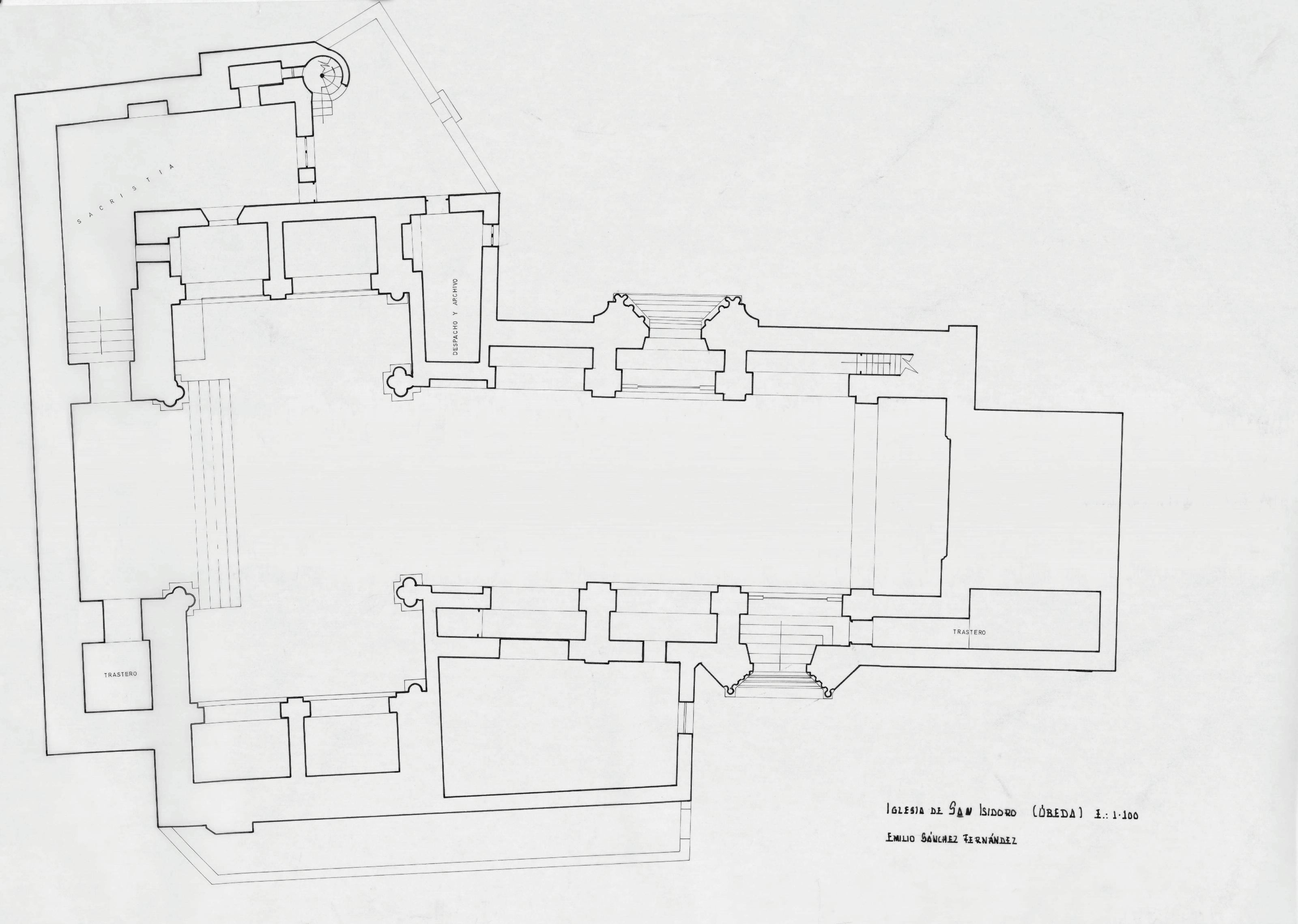 IGLESIA DE SAN ISIDORO- JAEN -: PLANTA GENERAL, Planta general de la iglesia, aparece señalado la zona de trastero, despacho, archivo, y sacristia. plano sin cotas.