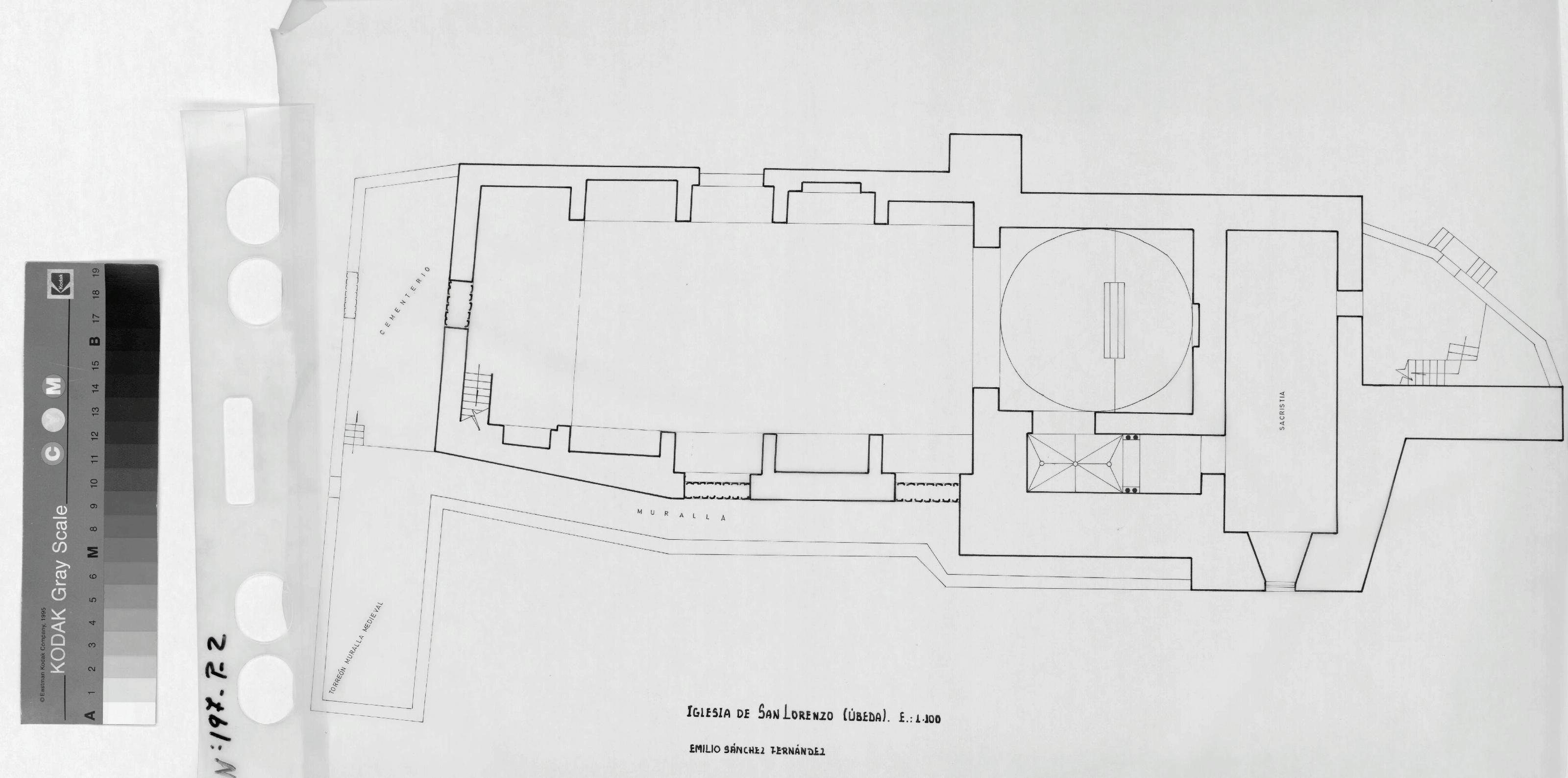IGLESIA DE SAN LORENZO- UBEDA - JAEN .: PLANTA BAJA . Plano , donde aparece marcada la zona de la sacristia , plano sin cotas.