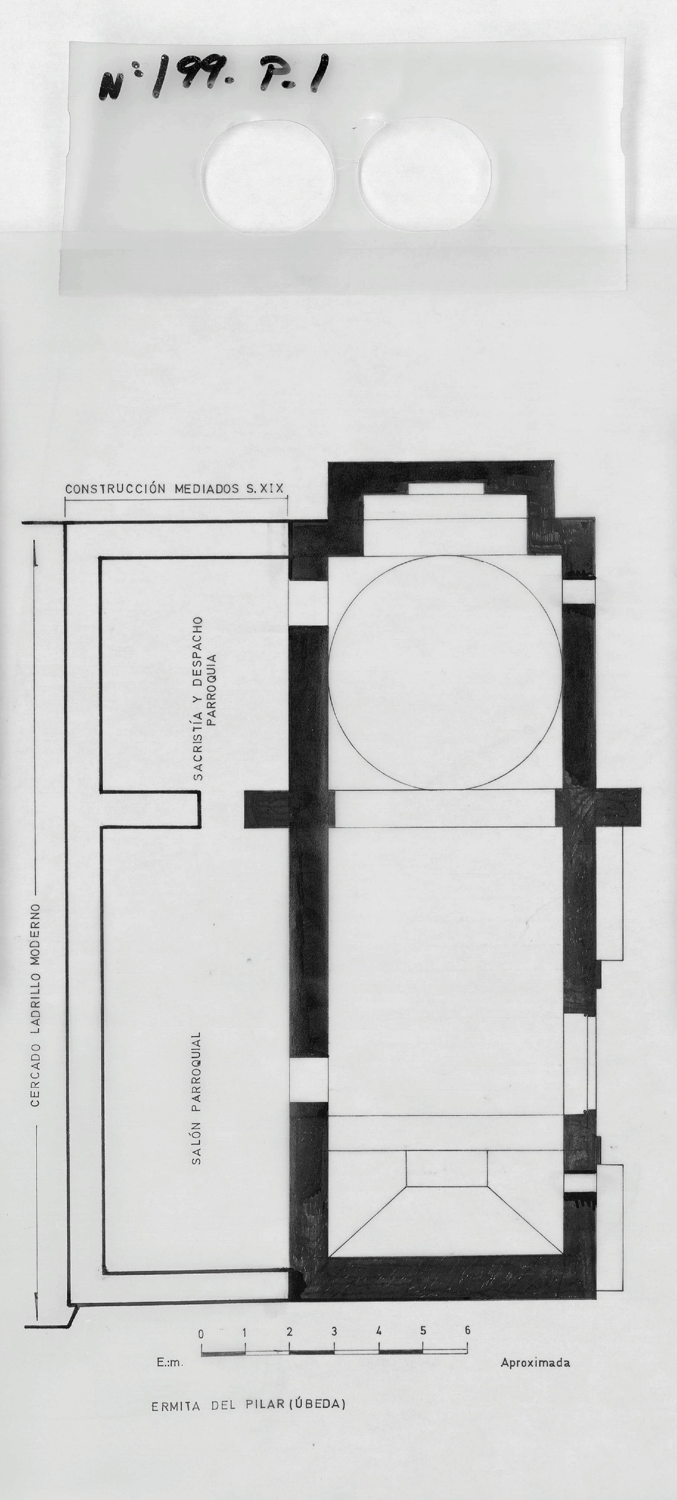 ERMITA DEL PILAR - UBEDA - JAEN .: PLANTA BAJA . Plano , tipo croquis, donde aparece marcada la zona de despacho, sacristia y salon parroquial, plano sin cotas.