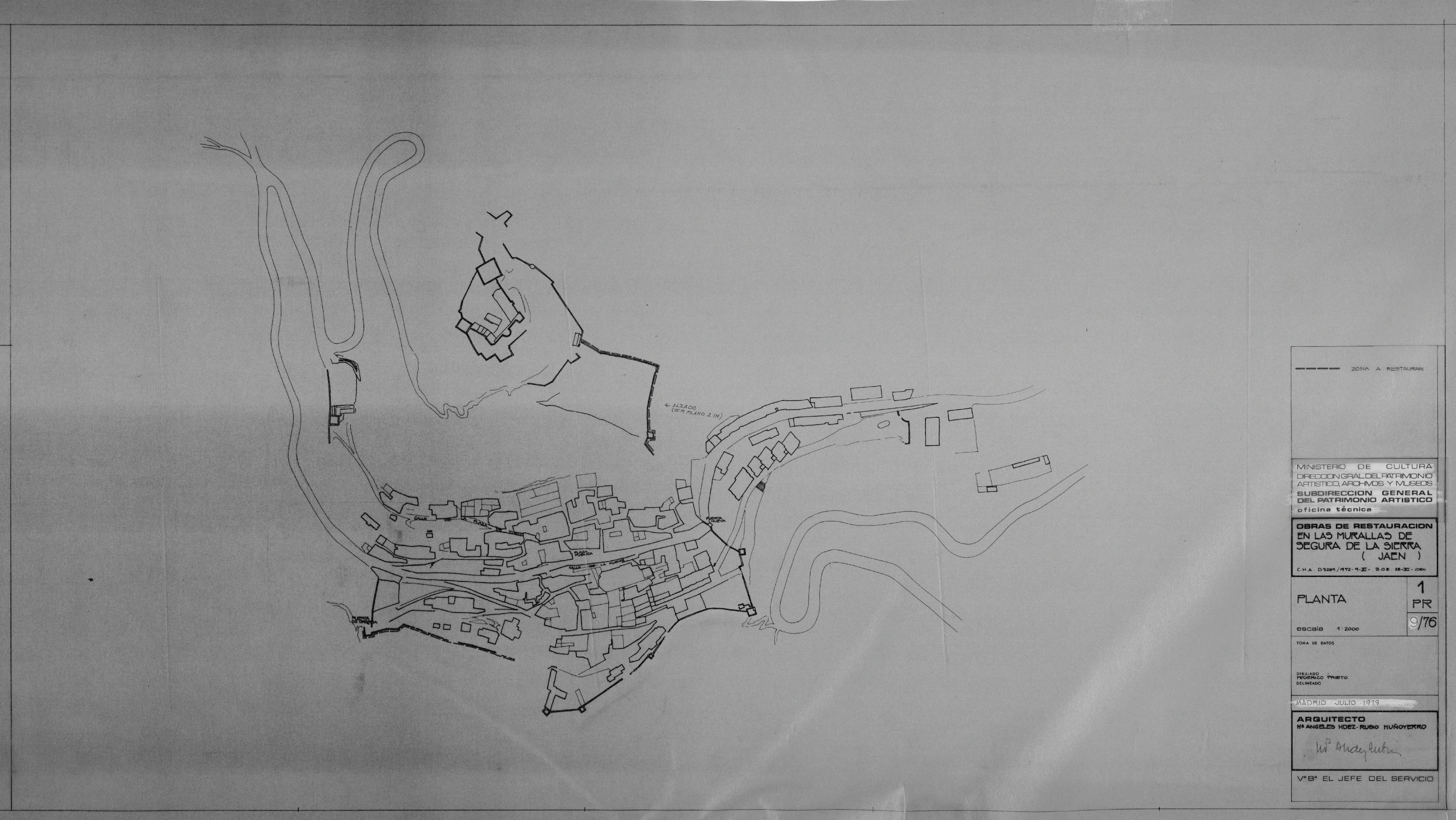 MURALLAS DE SEGURA DE LA SIERRA. JAEN.: PLANTA GENERAL. Planta general del recinto , marca una zona a restaurar, plano sin cotas.