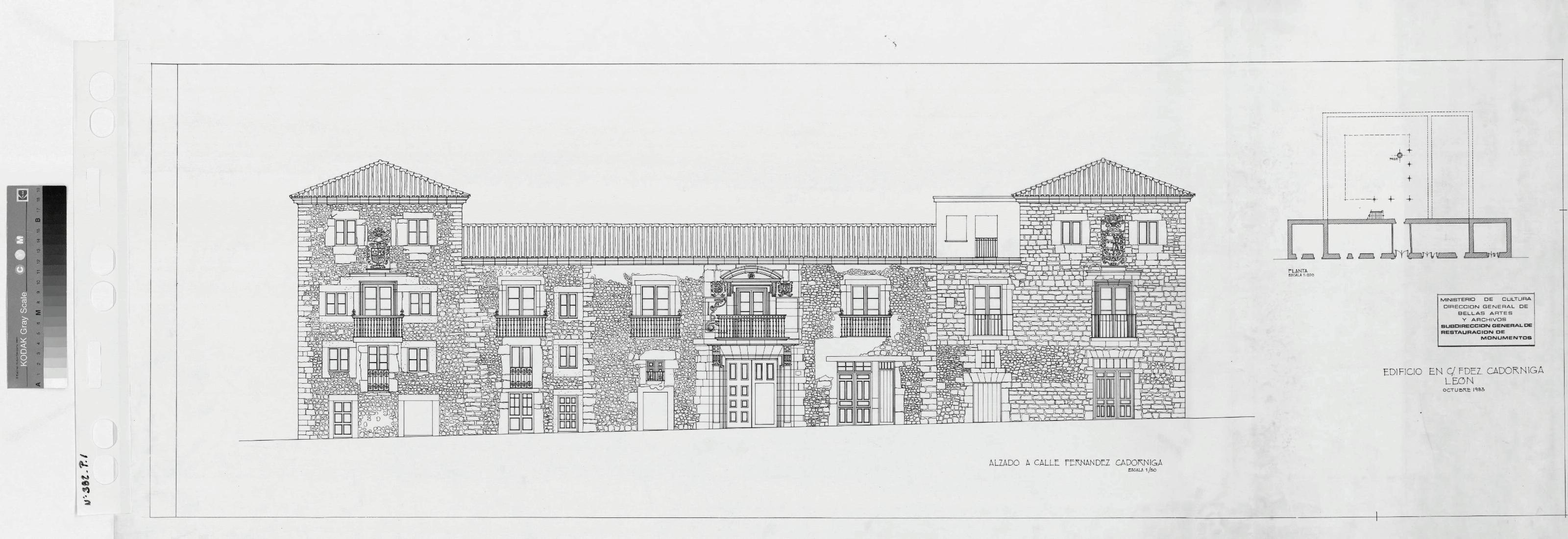EDIFICIO EN C/. FDEZ. CADORNIGA - LEON: ALZADO - A C/. Fdez. Cadorniga Con despieces y rayados así como blasones y ornamentación. Con tiene una planta a e:1/200 de la zona correspondiente a esta fachada. Sin firmar