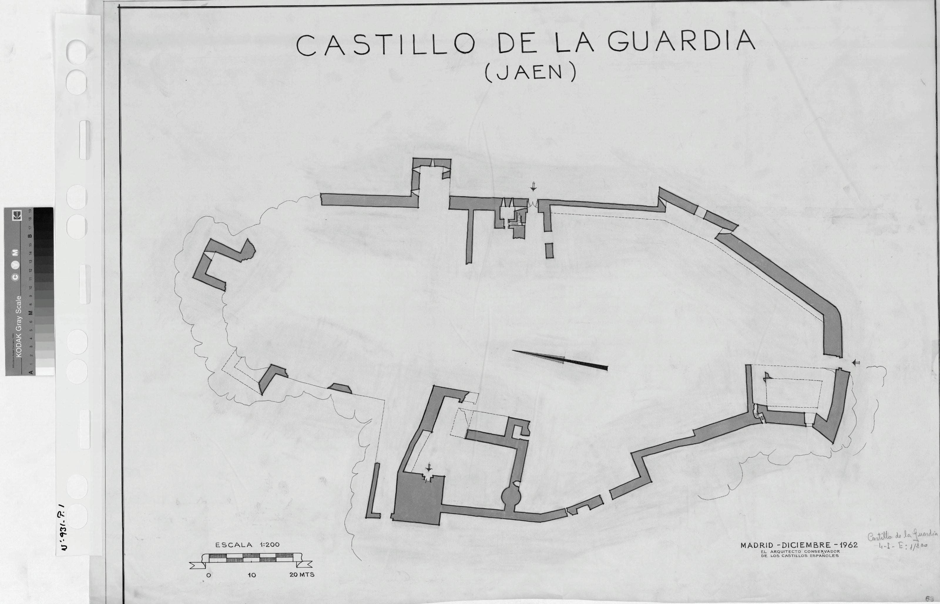 CASTILLO DE LA GUARDIA. JAEN: PLANTA GENERAL. Plano de planta con todo el perimetro del castillo, estan los muros regruesados y otros dibujados pero derruidos, plano sin cotas.