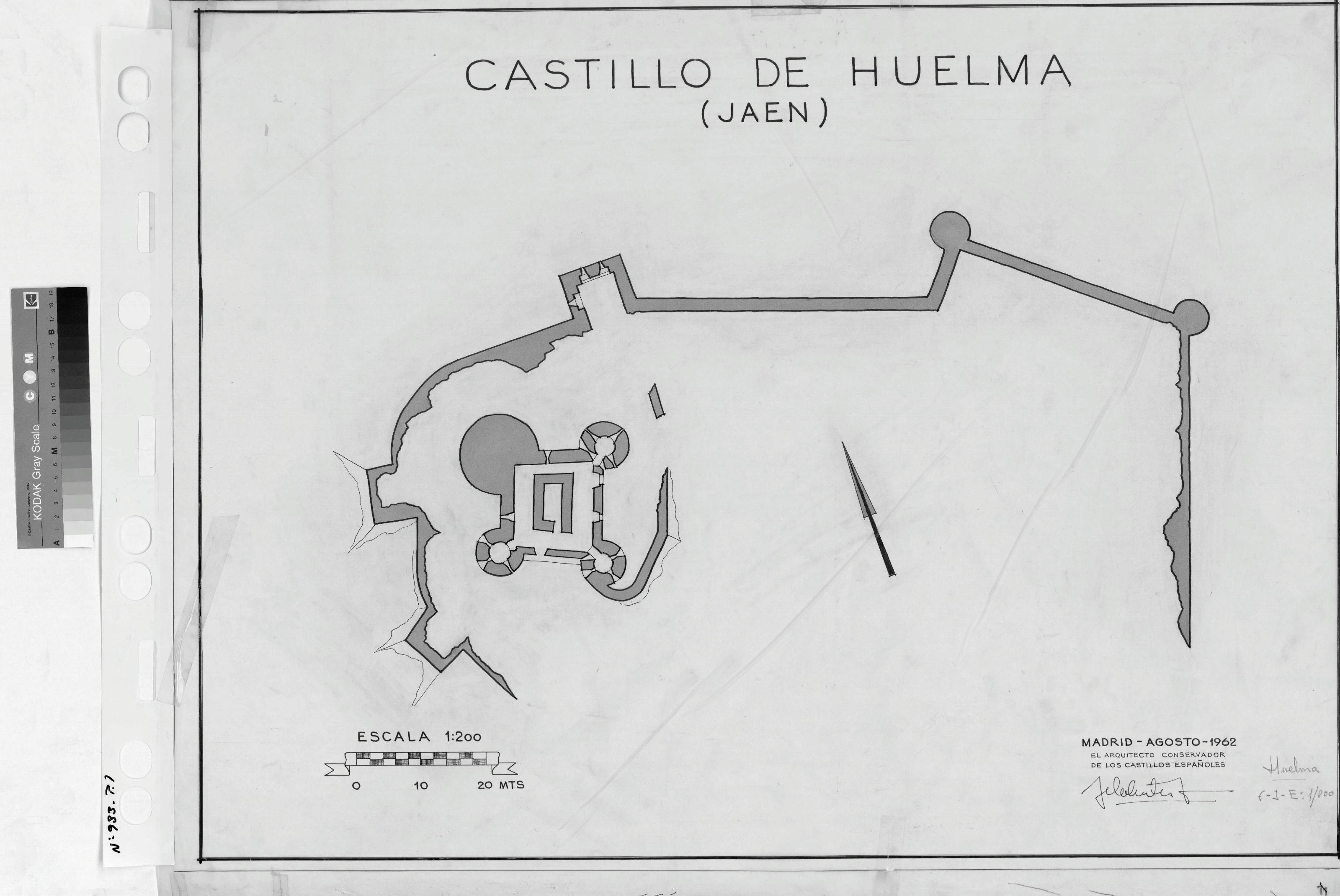 CASTILLO DE HUELMA. JAEN: PLANTA GENERAL. Plano de planta con todo el perimetro del castillo, estan los muros regruesados y otros dibujados pero derruidos, plano sin cotas.